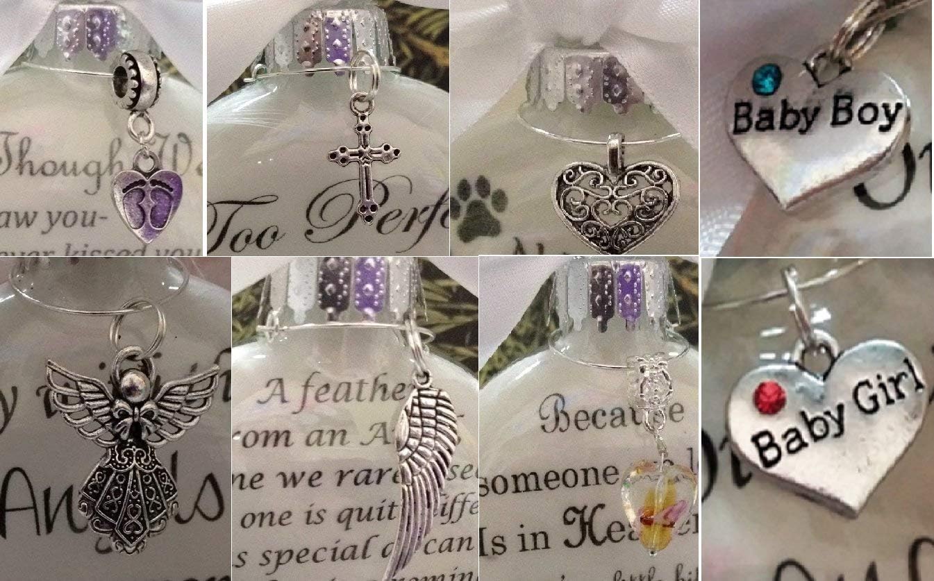 This beautiful 3 inch (approx. 10 cm) round, 1 inch thick glass ornament is filled with soft white feathers (they show through the back of the ornament) and vellum printed with the words "The first thing you saw when you opened your tiny little eyes was the face of Jesus." And can be personalized with your precious one's name. If no name was given or the sex of the baby unknown, then you can use "Baby (last name)" or "Angel (last name)" or the personalization can be left off. It is then topped your choice of a hand-tied white, soft pink, soft blue, yellow, lavender, or mint green ribbon. Please choose from the options menu. You can also choose to add a beautiful charm or crystal birthstone to make your ornament even more special. Choose from the charms available in the drop down menu. Your ornament comes wrapped in tissue and gift boxed. Deluxe gift wrap is also available- please see options available at checkout. Display stands are also available from the drop down menu if you would like to display your ornament year round. Thank you! *PLEASE NOTE: If you purchase the pictured product from anyone other than myself, Christy Wilcox at The Creative Canvas, you are NOT purchasing the item pictured. **All images shown were taken by myself, Christy Wilcox at The Creative Canvas, of my original handcrafted ornaments & designs; therefore, are my property, and are NOT to be used by anyone other than myself.