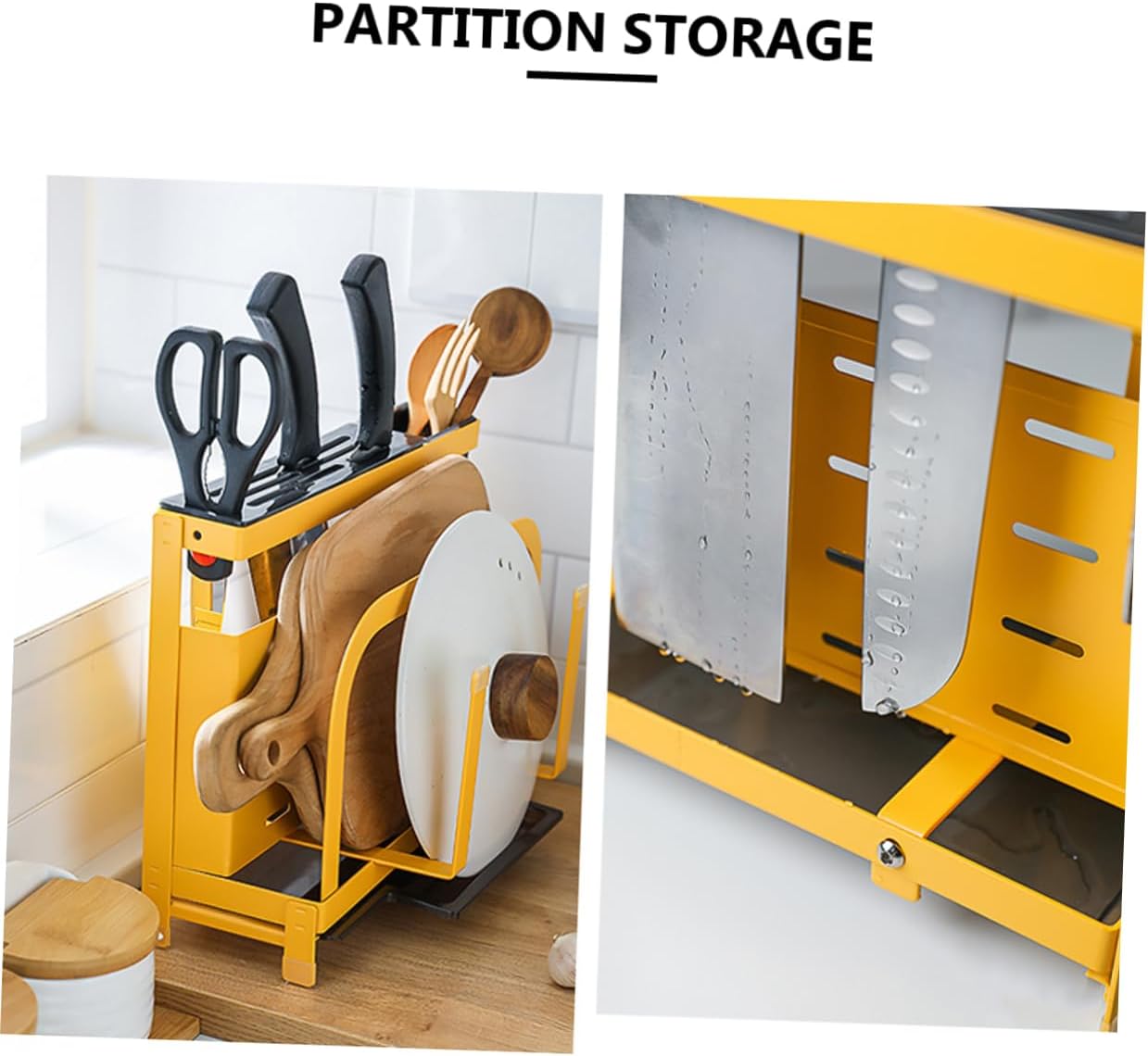 Package List 1 x Storage Rack Features - Color: Yellow Rack. -Size: About 33.2x25x11.4cm/ 13.07x9.84x4.48 inch Holder. - Material: Iron. - Made of material for lasting use Cutlery Holder Organizer. - Elegant and space saving design, the holder rack is easy to clean and maintain Cutting Board Storage Shelf. - With anti-slip design, and cutting board won't fall off Cutting Board Rack. - Multiple slot design offers a place for your and cutting board to stay firmly and sturdy enough and won't tip over. - Suitable for kitchen, restaurant, hotel and all kinds of party.Goods InformationCutlery Holder Organizer It is suitable for kitchen, restaurant, hotel and all kinds of party.Rack The item is iron cutting board holder, which is perfect for putting cutting board, and chopsticks.Cutting Board Rack With elegant and space saving design for modern kitchens, the holder rack is easy to clean and maintain