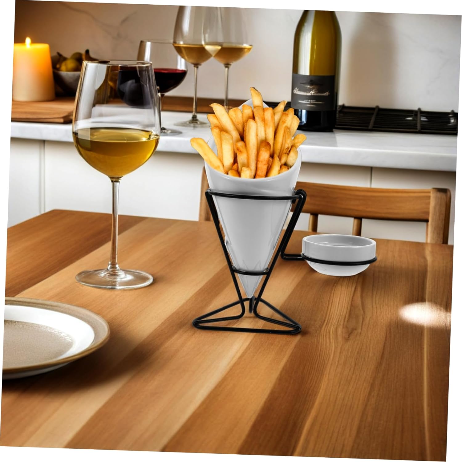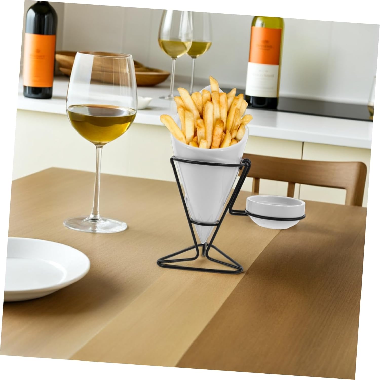 Package List 1 x French Fries Rack Features -Versatile usage: ideal for serving french fries, chips, and other snacks, suitable for restaurants, home gatherings, or casual parties snack stand -Modern aesthetic: combines contemporary and classic design, seamlessly fitting into various kitchen or restaurant decor styles snacks ceramic bowl with cone -Material:Iron, ceramic french fries container -Size:23.00X21.00X10.00cm/9.04X8.25X3.93in french fries organizer -ceramic appetizer serving plate: made from ceramic, ensuring use and easy cleaning for handy maintenance restaurant fry chips cone basket -Stable construction: designed for secure placement, this fry holder set adds convenience and elegance to any dining table or countertop cone holder -Color:White french fries rack -Unique appetizer serving dishes: elevate dining experiences with a stylish ceramic fry holder set, perfect for presenting appetizers and snacks in a refined and professional manner restaurant chips serving basket -Product Info:Western French Fries RackGoods Informationceramic appetizer serving plate This Western-style ceramic french fry holder set is perfect for restaurants and home use.chips holder with sauce dipper The ceramic material durability and a sophisticated look, making it a great addition to any dining experience.snacks serving cone basket The elegant design features a cone-shaped basket and a matching plate, ideal for serving appetizers, snacks, and side dishes