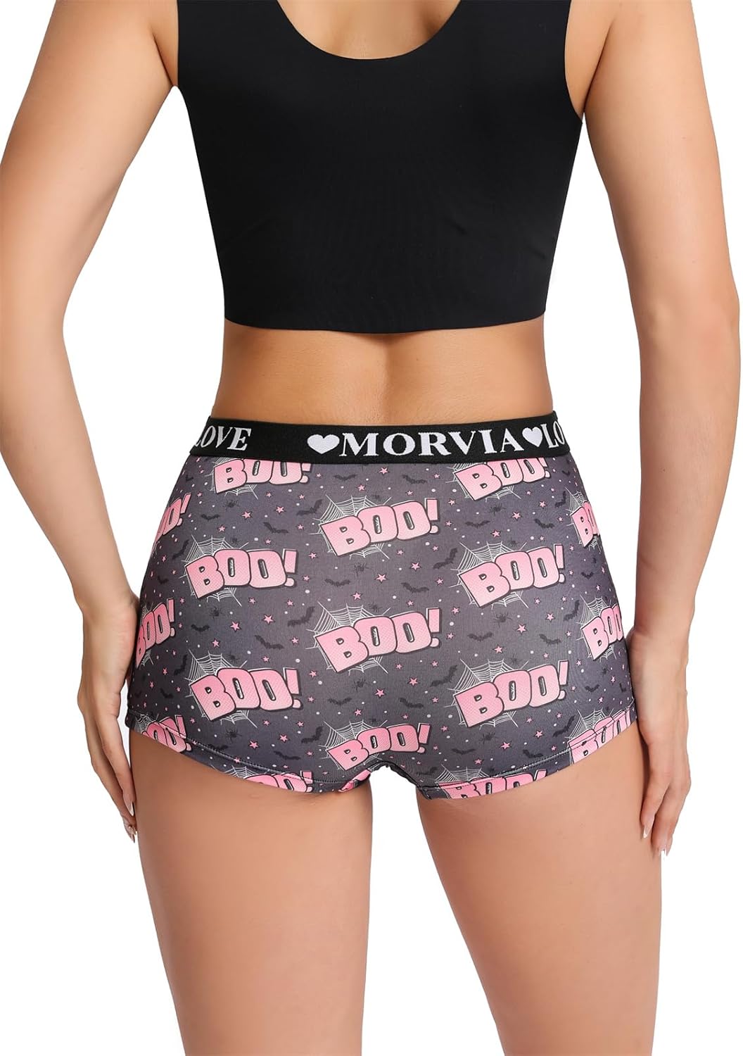 Make a bold statement with these Morvia Gothic Halloween-themed boyshorts. This set of 6 high-waisted underwear features an array of eye-catching designs including skulls with pink roses, starry nights, spooky bats, and mystical sun patterns. The wide elastic waistband, emblazoned with the 'Morvia LOVE' logo, provides comfortable support while the full-coverage boyshort style offers maximum comfort and security. Each pair showcases unique all-over prints that blend edgy gothic elements with feminine touches. The high-waisted design and hip-full wrap ensure these stay perfectly in place throughout your day. Perfect for those who love alternative fashion with a comfortable twist, these boyshorts combine practicality with distinctive style. The patterns in each pack let you choose the perfect pair to match your mood, while the quality construction ensures lasting wear. The comfortable stretch material adapts to your body while maintaining its shape through regular wear and washing.
