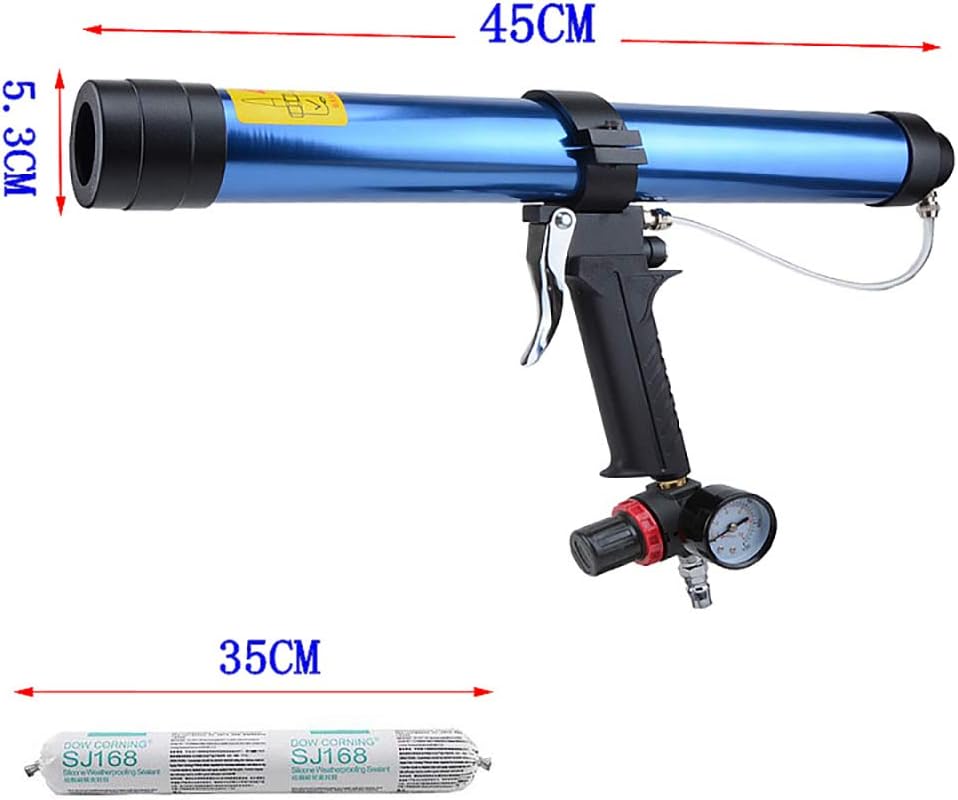 PRODUCT FEATURES 1) 145kgf (1.45kN) thrust at a working pressure of 6.8bar; 2) Act directly on the bottom of the cartridge; 3) Silencer is standard configuration (noise below 70dB); 4) Quick exhaust valve to minimize the overflow of glue; 5) Rotatable air pipe joint makes operation more free and flexible; 6) Suitable for indoor environments requiring low noise; PRODUCT INTRODUCTION 1. Pneumatic glue gun is a special tool in the construction, household appliances, automobiles, containers and other industries that need to implement the gluing and sealing process. The operation is simple, convenient, fast and labor-saving, especially suitable for large-scale continuous operation. 2. Pneumatic glue gun is used in automotive, electronics and construction industries; durable, labor-saving, high quality and efficient. 3. Pneumatic glue gun Fast pneumatic glue gun for barrel filling, there are specifications of 310ml, 400ml, 600m.