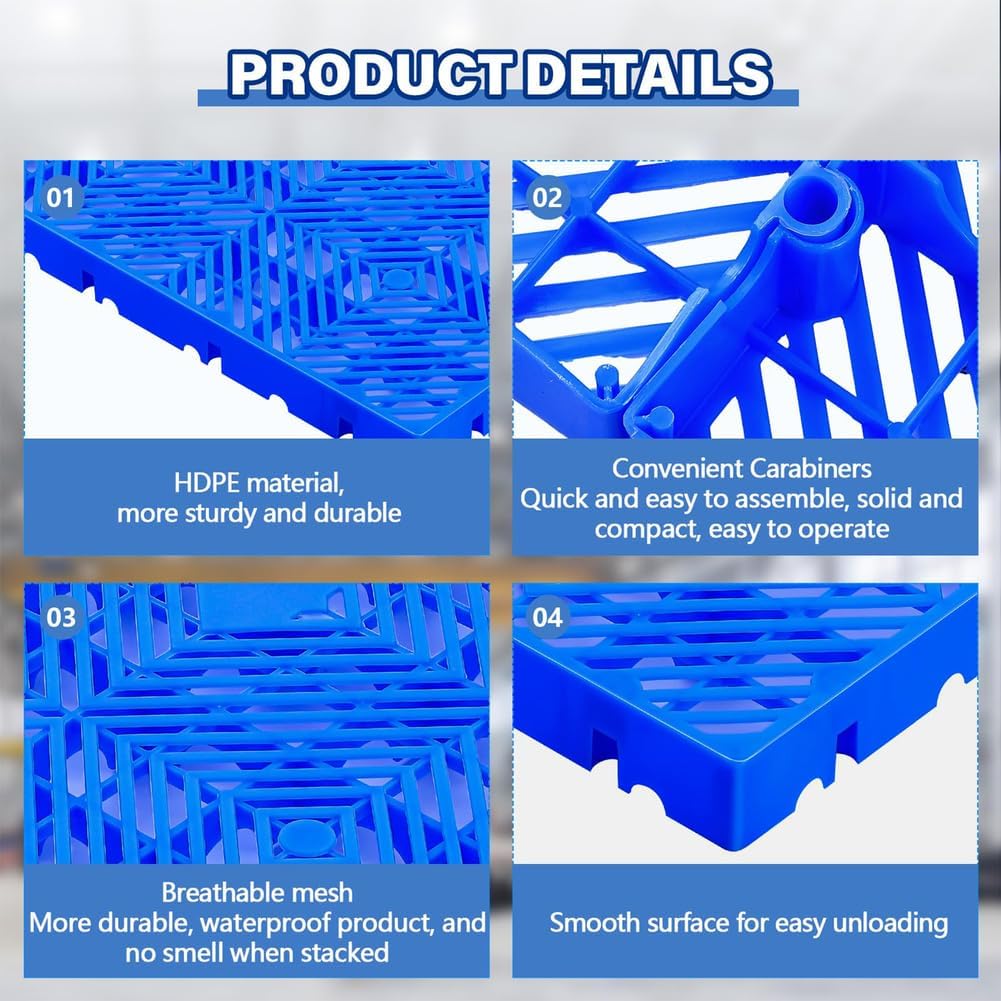 The plastic pallets are made of brand-new plastic material, sturdy enough to support heavy loads. Multiple drainage and ventilation holes in the bottom reinforcement design improve the tray's stability and load-bearing capabilities. Anti-slip designs on the surface efficiently stop objects from sliding. The tray saves space by being able to be freely constructed and dismantled when not in use.Specifications:Material: HDPEColor: blueSize: 40 x 40 x 3cm/15.75 x 15.75 x 1.18in60 x 60 x 3cm/23.62 x 23.62 x 1.18inFeatures:Lightweight design: easy to carry and stack.Easy to clean: keep hygiene and easy maintenance.Keep dry: suitable for warehouses, supermarkets, etc., to ensure that items are dry and ventilated.Adapt to various climates: withstand all weather conditions.Package includes:4 x Plastic palletNotes:Manual measurement, please allow slight errors on size.The color may exist a slight difference due to different screen displays.