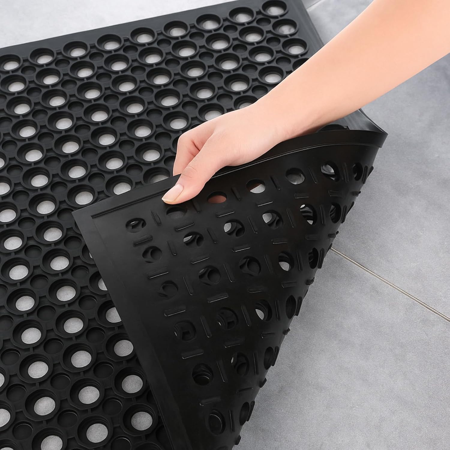 Features: Anti-slip Rubber Scraper Floor Mat -- Drainage holes reduce slippery liquids and oils on floors. Grease and water-resistant rubber keeps the mat in place, perfect for high-traffic areas like stores, workshops, garages, boats, bars and restaurants Specifications: Material: Rubber Color: Black Size: 24inch x 36inch Notes: Manual measurement, please allow slight errors on size. The color may exist a slight difference due to different screen displays