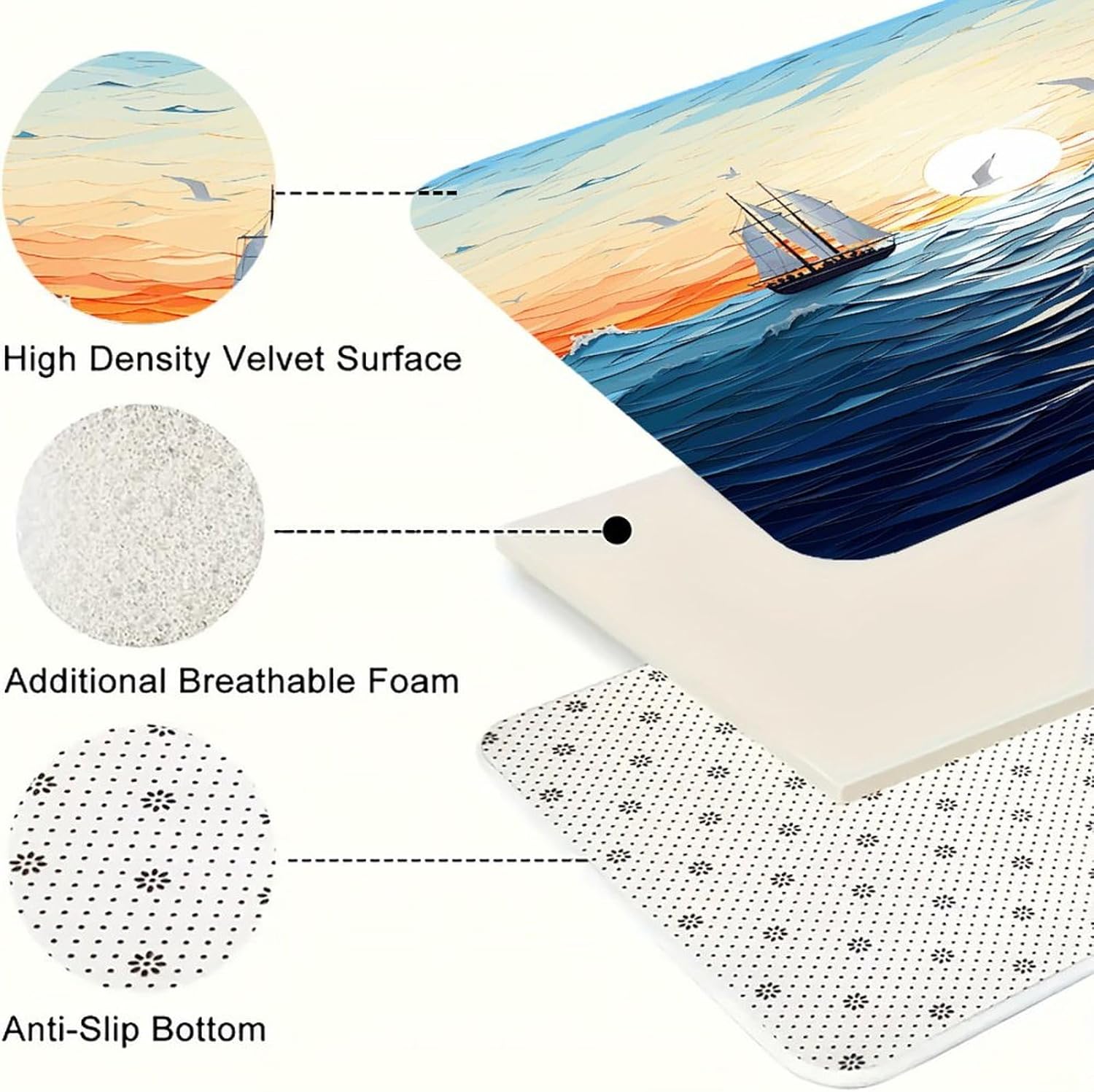 • Complete Set and Dimensions:This versatile collection includes three perfectly proportioned Ocean Waves Sailboat with Birds Maritime mats to cover key areas.You'll receive a long pad for in front of the sink or stove,a middle pad for central work zones,and a short pad for traffic spots or as a carpet for sink areas.The thoughtful sizing offers comprehensive coverage and layout flexibility for your kitchen or bathroom.