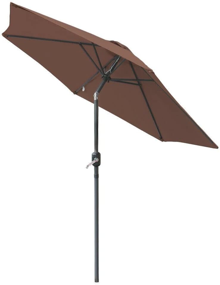 Feature -A super garden parasol with a wide, water-resistant canopy and a crank mechanism. -Crank winding mechanism to open and close parasol conveniently. -The Tilt and Crank Round Parasol will shield you and your fellow diners from damaging UV rays in the height of the summer. -This excellent garden parasol comes with a natural finish aluminium frame. Compared with metal tube, our stainless aluminium tube doesnot tend to get rusted easily under uk humid rainy weather condition. -High quality 180G polyester fabrics and included top vents. Lift slider to extend your parasol outwards. -Tilt 30 degrees vertically, cannot rotate horizontally. Specification -Condition: Brand new -Colour: Coffee -Material: aluminium pole, 180g/m2 polyester fabric cover -Style: With crank and tilt -6 metal ribs -Aluminium Pole: diameter 38x1mm -Umbrella height: 2.2m -Umbrella diameter: 2.5m