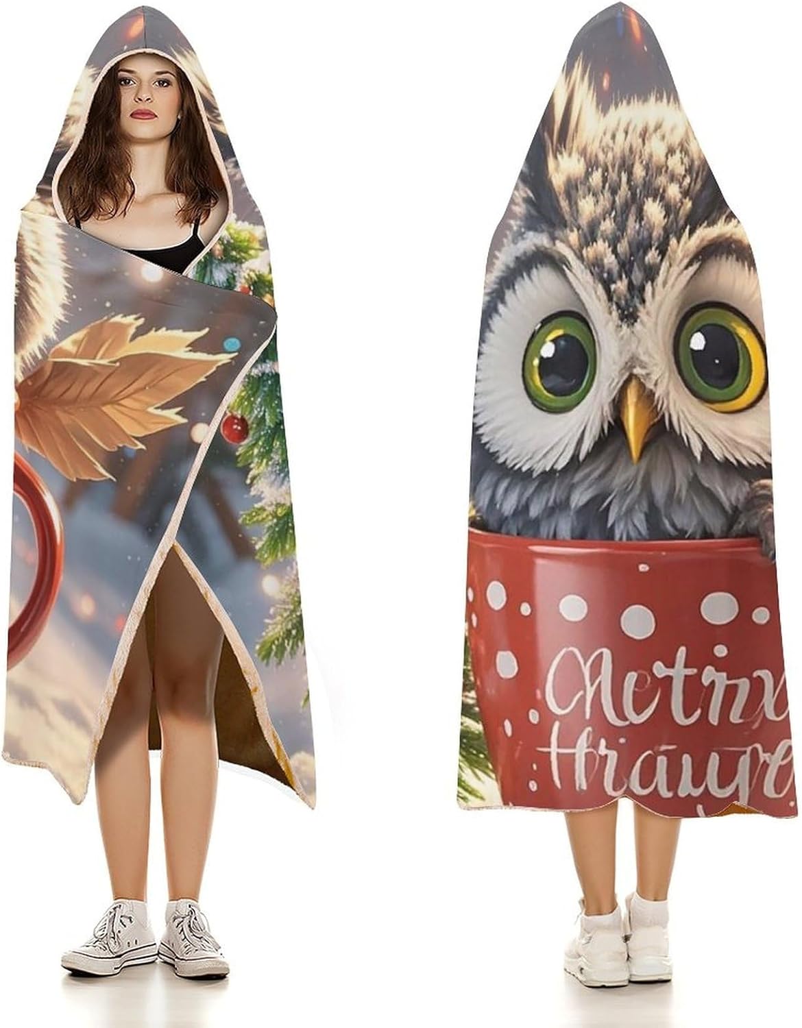 Wrap yourself in luxury with our Wearable Hooded Blanket!PREMIUM MATERIAL:Crafted from premium arctic velvet, this reversible blanket combines ultra-softness with durability. The smooth, non-shedding surface and flesh-pink interior feel gentle against your skin, while the breathable fabric ensures comfort without overheating.PRACTICAL BLANKET:Designed for convenience, the attached hood stays secure without dragging, making it easy to move around while staying cozy. Whether you're reading on the sofa, camping outdoors, gaming with friends, or napping, this wearable cloak blankets you in warmth wherever you go.DURABLE & SKIN-FRIENDLY:Meticulously stitched with vibrant colors, this Owl Cup blanket retains softness and shape after washing. No bleach required. Designed for everyday use.EXQUISITE WORKMANSHIP:Delicate stitching, high-definition printing and dyeing, clear patterns, bright colors, no fading, many choices, it is warm and beautiful when worn on the body.WARM GIFT:This super soft cloak blanket is specially designed for intimate love, loved ones, friends gift for Christmas Thanksgiving gifts, beautiful and soft blanket is to bring them warmth, joy and love feeling.EASY MAINTENANCE:Machine washable (cold water) for hassle-free cleaning, it retains its vibrant color and plush texture wash after wash. Embrace versatility and comfort.Size:40 inches x 50 inches / 100cm x 130cm50 inches x 60 inches / 130cm x 150cm60 inches x 80 inches / 150cm x 200cmI wish you a pleasant shopping experience!