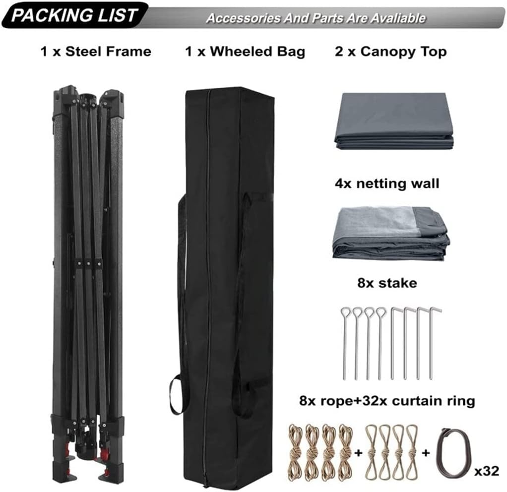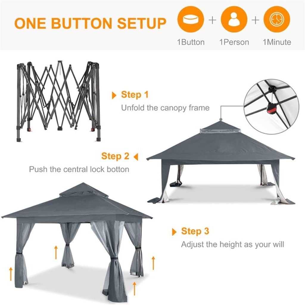 POPS UP DESIGN: No more annoyance of setting up for hours,this gazebo is design of poping up,which takes you only MINUTE to set up,Save a lot of time.SPACIOUS SPACE: Designed with 10'x10' straight leg frame and 13'x13' coverage at the top,providing 169 square feet of coverage. Spacious enough to accommodate 8-12 and several chairs.MORE COMFORTABLE & PRIVATE: Four removable ZIPPERED mesh walls and vented roof,creating a great-airflow environment,Provide more privacy at the same time.MATERIAL: Constructed with powder-coated steel frame and 150D silver coated polyester fabric,Sturdy, rust and water-resistant, UPF 50+, blocks 99% harmful UV rays. NOTE: Please kindly take it back during windy and rainy days to extend the service life.VERSATILE USAGE: Be best for your lawn, patio, garden, back yard, poolside. Suitable for outdoor activities such as small businesses, craft shows, picnics, camping, partiesMaterial: Steel and polyester fabricOverall 13' W x 13' D x 8' 10 13/16'' HSquare Footage 169 square feetInterior Interior Width - Side to Side 13'Interior Depth - Front to Back 13'Interior Height - Top to Bottom 9'Overall Product Weight 55 lb.Roof Hanging Weight Capacity 5 lb.The width between the legs is 10 ft.Package Include:1 X Tent1 X Storage Bag(Other demo items not included).Note:Due to different monitors and lighting effects, the actual colour of the product may differ slightly from the colour shown in the pictures. Thank you!Please allow 1-2 cm deviation due to manual measurement.The side wall of the net blocks unwanted guests with wings, and the side curtains can prevent wet environment.