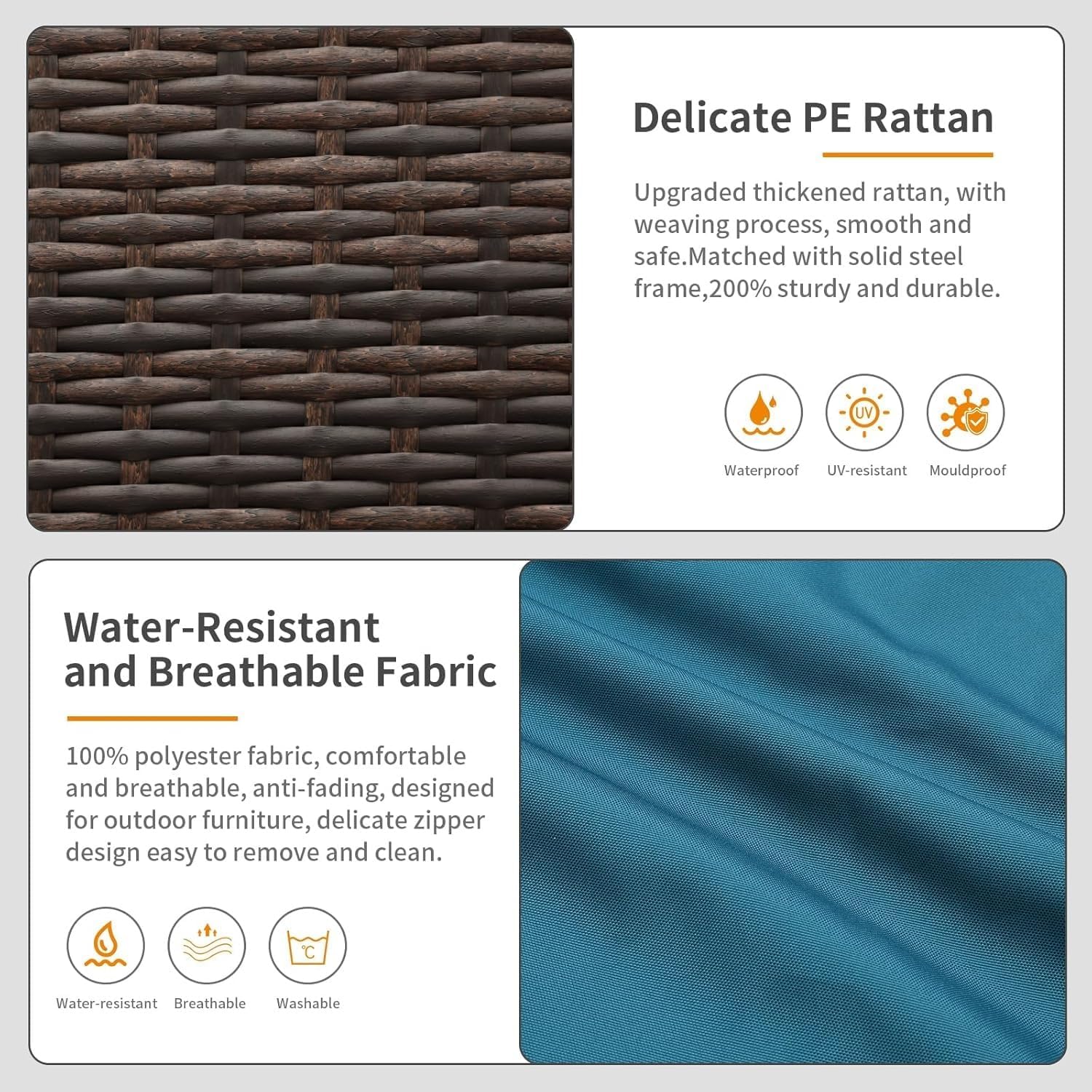 Specification:Material: steel frame, high-density polyethylene wicker, high resilience sponge, polyester fabricFrame Color: brown wicker, peacock blue cushionsChair Design: deep seatingDimensions(L*W*H/(in)):total size: 57*31*30seat width: 48seat depth: 26seat height: 18seat cushion: 26*24*4back cushion: 24*24Set Include:1 Boxoutdoor sofaOther items included in the box2 seat cushions2 back cushions1 waterproof coverinstructions and all necessary hardware
