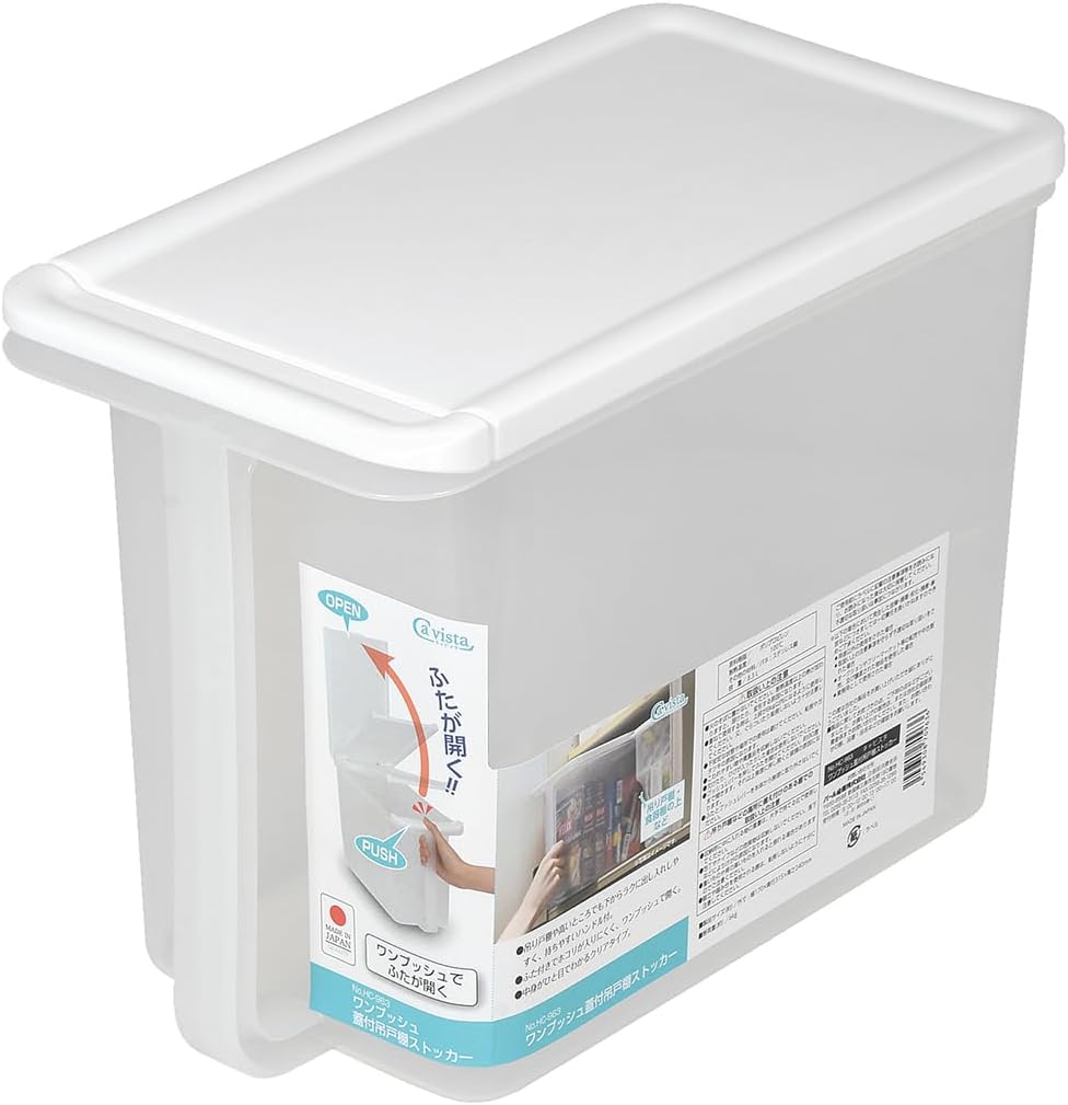 Product Size (W x D x H): Approx. 6.7 x 12.4 x 9.4 inches (17 x 31.5 x 24 cm); Capacity: 2.1 gal (8.3Product Weight: Approx. 1.2 lbs (0.569 kg). Resin: Body: Polypropylene (heat-resistant temperature: 212°F (100°C)); Other Materials: Spring: Stainless steel Country of Manufacture: Japan. For hanging cabinets, over cupboards, etc. Clear type that allows you to see the contents at a glance. The lid prevents dust from entering and opens with a push of the button. Includes handle for easy access and removal When stacking, please use the upper tier within 13.2 lbs (6 kg). Also, be careful not to wobble or fall over. Do not store delicate items or valuables. Press the push lever to open the lid. Opens to approximately 90 degrees. Forcing it open will cause damage. Do not put near fire. Heat exceeding heat temperature may cause it to melt or deform. Please do not force remove the lid and push lever from the main unit. Note: We will not be responsible for any breakdown, damage, accidents, etc. due to the sale or used sale or transfer. Thank you for your understanding
