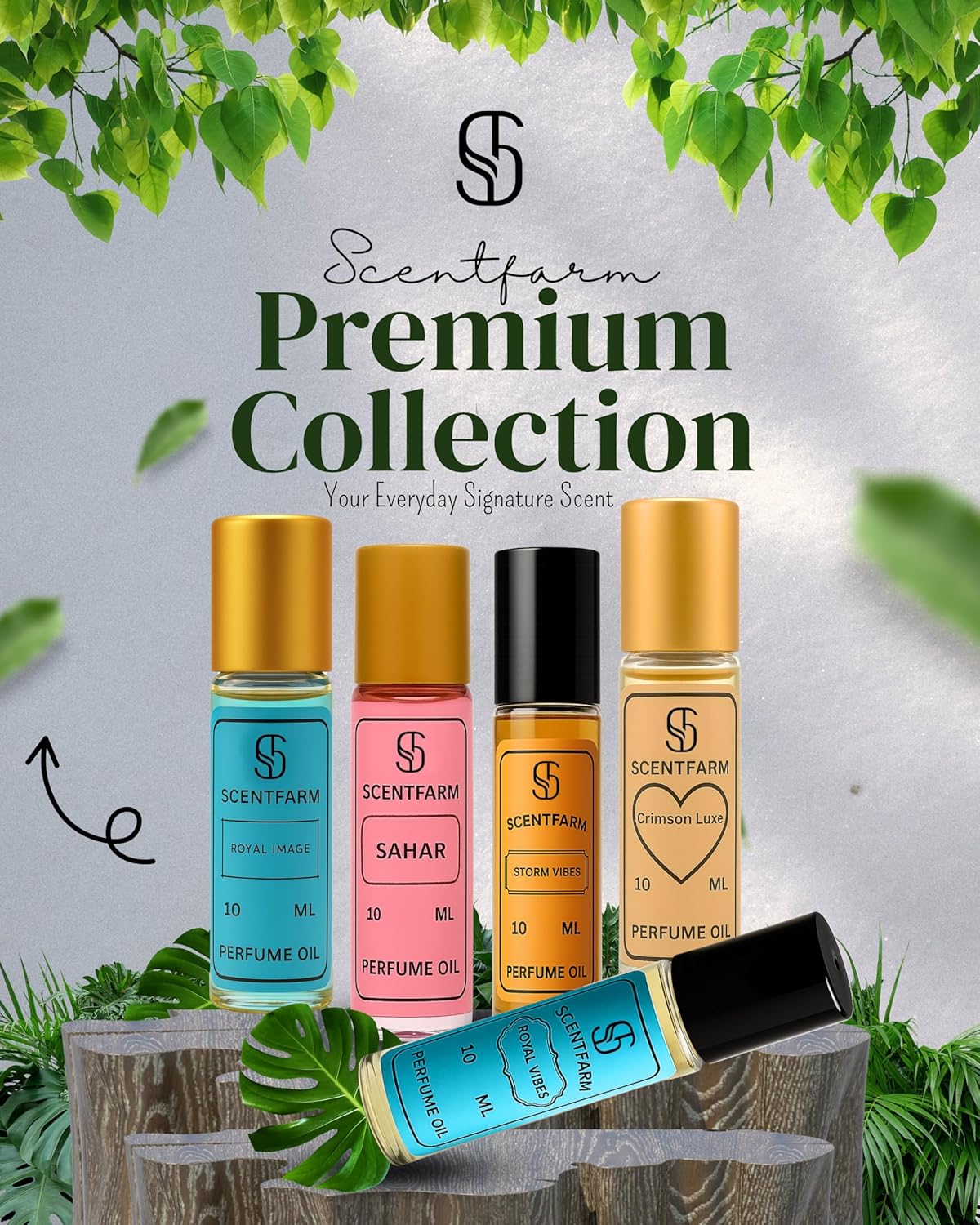 ScentFarm Perfume Oil 5-in-1 Set – Long-Lasting Alcohol-Free Roll-On Fragrance Oils for Men & WomenExperience the elegance of ScentFarm Perfume Oil 5-in-1 Set, expertly crafted for men and women who appreciate long-lasting, alcohol-free, and concentrated perfume oils. Each 10ML roll-on delivers premium fragrance with exceptional longevity, ideal for daily wear, office, special occasions, or gifting.This set features five signature scents: Crystal Elevé – fresh and uplifting; Sahar – warm and exotic; Amber Eclips – deep and sensual; Crimson Noir – bold and sophisticated; and Royal Image – timeless and elegant. Each fragrance is designed to impress and leave a lasting impression, whether layered or worn individually.Formulated with high-quality fragrance oils, the roll-ons are gentle on skin, alcohol-free, and travel-friendly, making them perfect for home, office, or on-the-go use. The compact design ensures convenience and portability, while the curated scent selection provides variety and versatility in one elegant set.ScentFarm brings luxury and refinement to your daily routine, combining style, sophistication, and long-lasting performance. Ideal for men, women, and perfume enthusiasts, this 5-in-1 collection allows you to express your personality, enhance your presence, and enjoy exquisite fragrances anytime.Elevate your fragrance experience with ScentFarm, where concentrated perfume oils meet professional quality, elegance, and lasting impression.