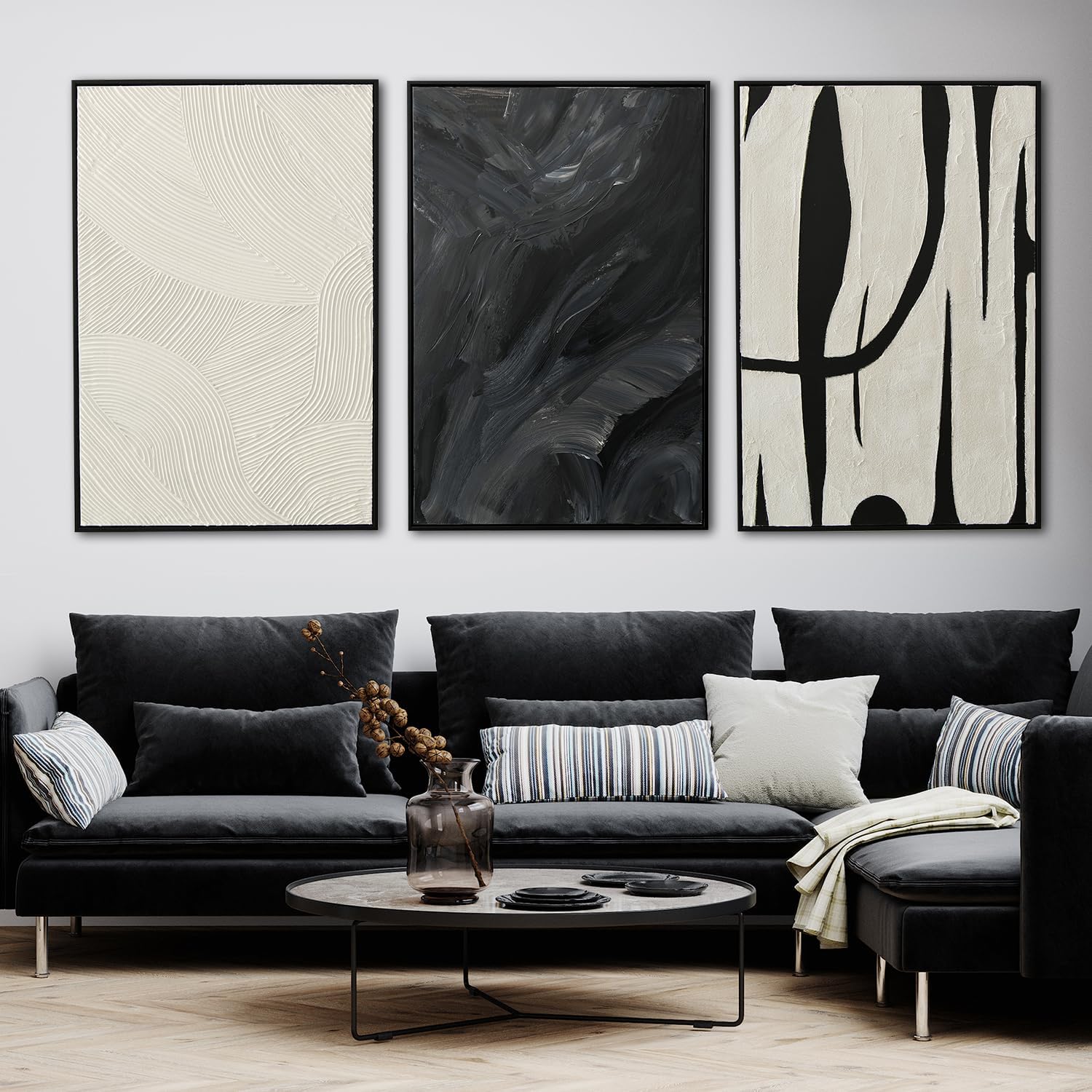 Transform your living space with Pigort's Abstract Wall Art for Living Room – a stunning set of three large framed canvas paintings that bring elegance and modernity to any room. Featuring a captivating black and white palette, these 3D textured artworks offer both visual depth and a minimalist aesthetic, making them perfect for bedrooms, guest rooms, hallways, and home offices. The large 24"x36" size ensures that each piece commands attention, while the strong packaging guarantees safe delivery right to your door. Elevate your home decor with Pigort's timeless and sophisticated abstract wall art today!