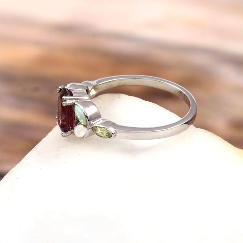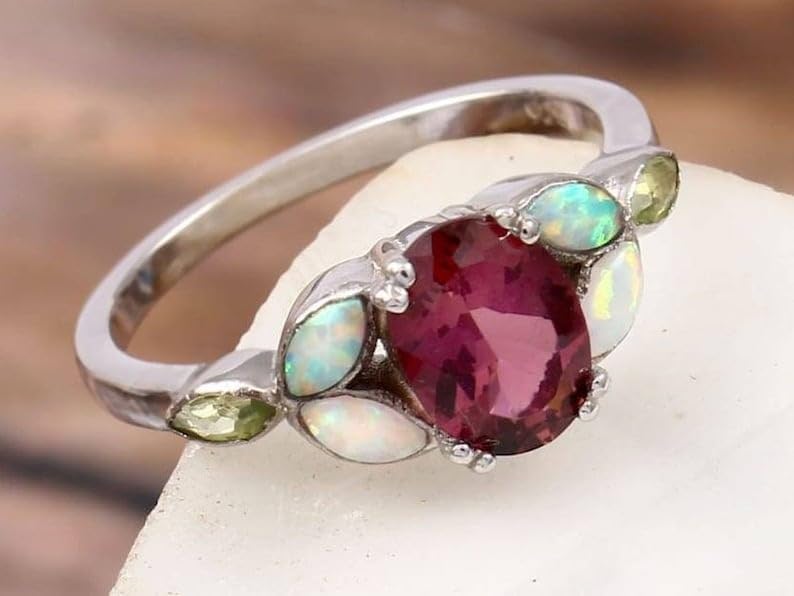 Celebrate timeless love and individuality with this exquisite Pink Tourmaline & Opal Engagement Ring, thoughtfully crafted to be as unique as the person who wears it. Set in 925 sterling silver finished with rhodium, this stunning ring features a 9x7 mm natural oval-cut pink tourmaline at its center—symbolizing love, compassion, and emotional healing.Accentuating the centerpiece are shimmering faceted marquise-cut peridot and opal side stones (2x4 mm), naturally created to highlight a delicate contrast of soft white and radiant green hues. Together, these vibrant gemstones create a mesmerizing palette of color, reflecting beauty, strength, and balance. The unique combination of stones makes this ring a true standout, perfect for those who appreciate fine craftsmanship and rare design.Whether you're proposing a lifelong promise, celebrating an anniversary, or simply giving a heartfelt gift, this ring is suited for every meaningful occasion. It makes a thoughtful gift for birthdays, engagements, weddings, graduations, Valentine's Day, Mother's Day, and holidays like Christmas and Thanksgiving.Expertly cast using premium methods, this piece is more than just jewelry—it's a personal symbol of connection and memory. The ring is available in US sizes 4 to 12 and can be personalized to create a truly one-of-a-kind treasure.The Pink Tourmaline & Opal Ring is not just a piece of fine jewelry—it’s an expression of love, a statement of elegance, and a keepsake of special moments. Ideal for daily wear or cherished occasions, this piece brings together nature’s beauty and artisan skill in perfect harmony.