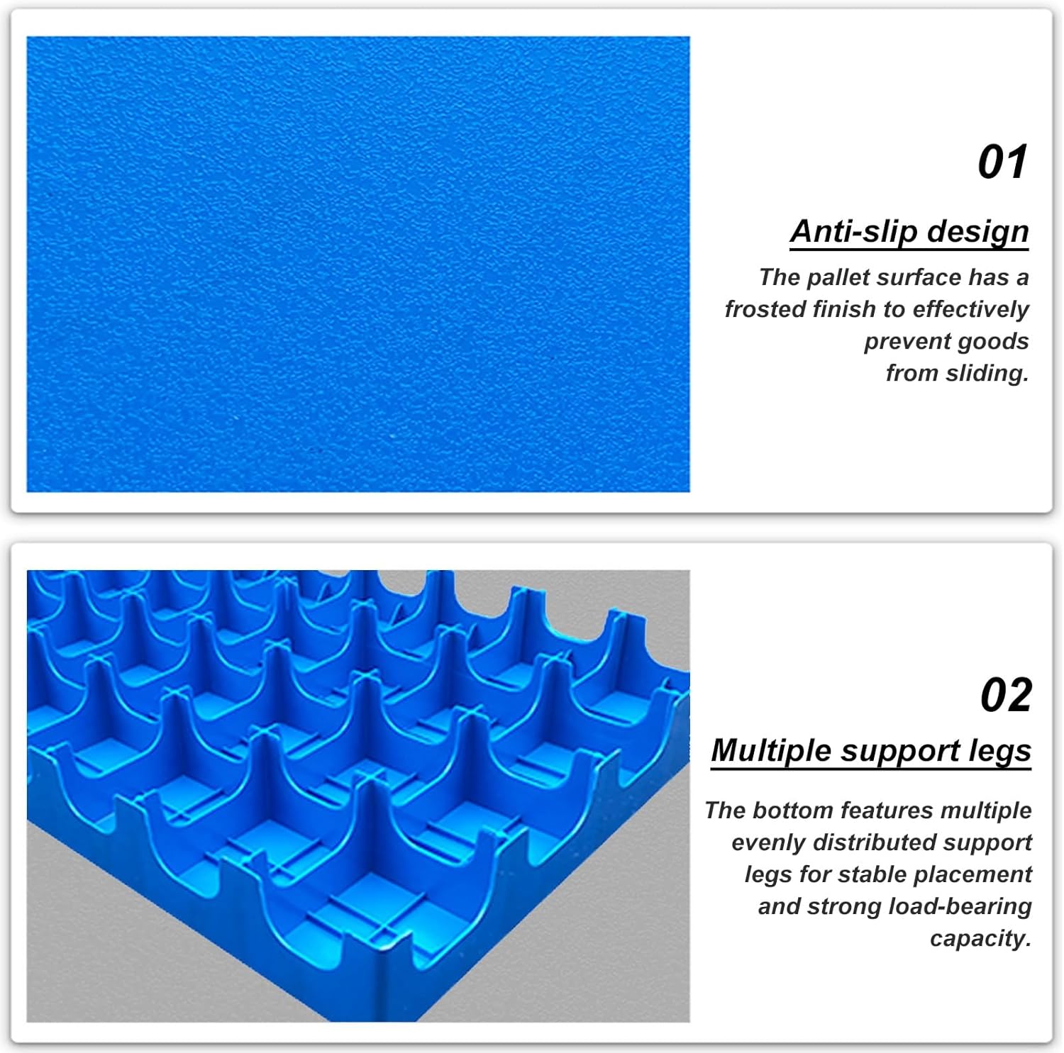 Product Details:Material: HDPEExcellent high and low temperature resistance (-40℃ to 90℃), and outstanding toughness.Product Details:1. Uniform pallet wall thickness, combined with bottom reinforcing ribs, allows for a static load capacity of up to 800kg; ensuring long-term use without deformation or cracking, meeting the needs of high-intensity operating environments such as warehouses and logistics centers.2. Frosted surface design effectively prevents goods from shifting.3. Rounded corners prevent damage from bumps and knocks during use, reducing loss rate. 4. Seamless, one-piece molding for easy cleaning.5. With its modular design, you can flexibly expand and combine pallets according to the actual layout needs of your warehouse or store, easily creating large-scale, uniform raised platforms, greatly improving storage and management efficiency and tidiness.Multi-functional Applications:Plastic pallets are suitable not only for warehouse stacking, logistics transfers, and factory production lines, but their low-temperature resistance also meets the needs of cold storage operations. In home settings, they can be used as shelf pads; the 4-inch raised design combined with a flat surface effectively prevents moisture, achieving a cost-effective solution for multiple uses.Dimensions: 60×100×10CM/ 24×39×4in