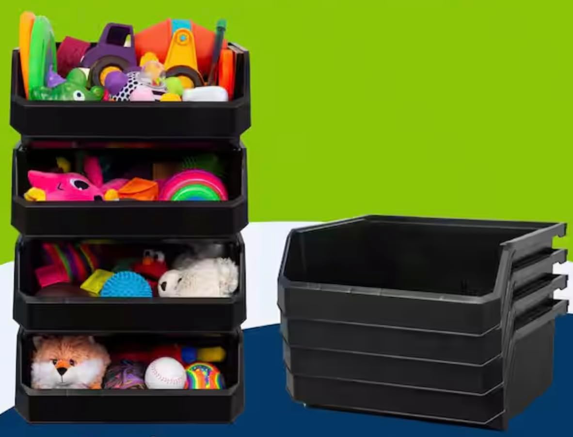 This set of large bins offers ample capacity for organizing bulkier items in various spaces, such as closets, pantries, garages, and craft rooms. Equipped with a wide open-front design, these bins facilitate easy visibility and retrieval of contents, even when placed on higher shelves. Crafted from resilient, plastic, they are designed to withstand daily use while maintaining cleanliness and efficiency in storage areas. Their stackable profile and smooth interior make them a versatile solution for optimizing space within your home. Perfect for organizing larger household items, pantry goods, linens, or craft supplies on shelves in closets, kitchens, or storage rooms, the largest size measures approximately 16.5 in. L x 14.75 in. W x 7 in. H, providing high-capacity storage.