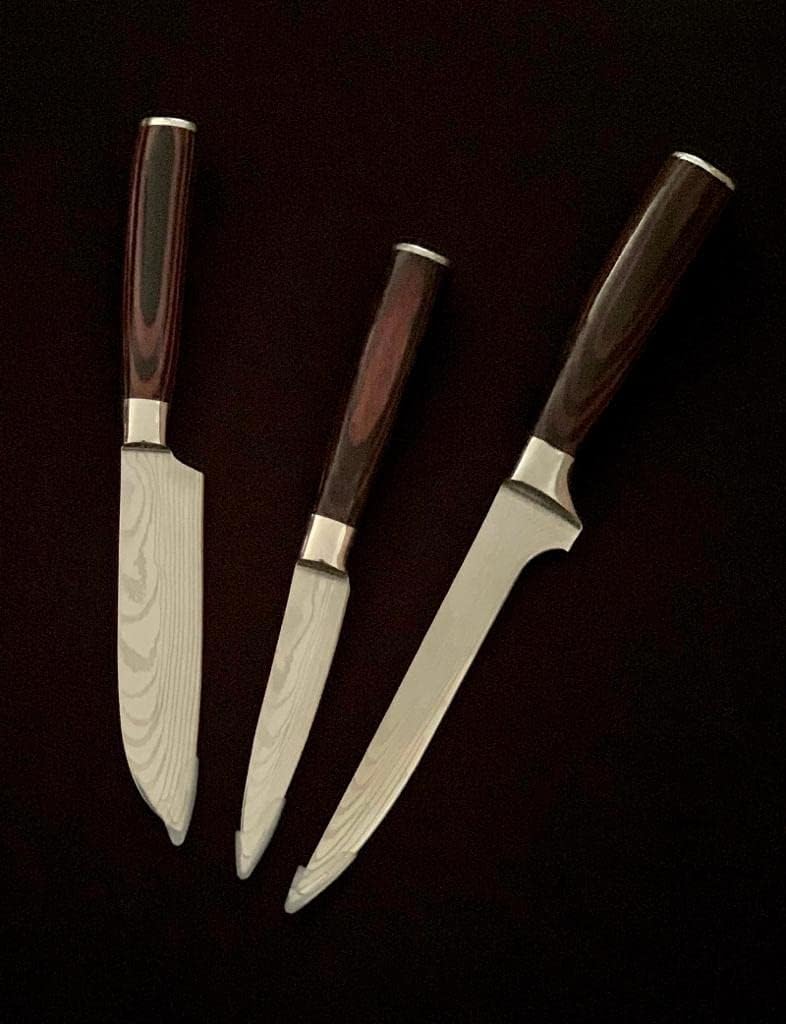 PRODUCT PARAMETERS ✅ Packing: Set of 3 pieces: 8 Inch Chef Knife 7 Inch Nakiri Knife br> 5.5 Inch Paring Knife ✅ Ultra Sharp Knife's Blades: The knife's blade is made of High-quality Stainless Steel, rustresistant and anti-corrosion. The razor-sharp edge is easy to maintain and makes cutting or chopping a breeze ✅ Ergonomic Handles: The handles are lightweight and comfortable grip, It makes long hours in the kitchen easy ✅ Multi-function Kitchen Knife set: ✅ These multipurpose knifes are ideal for various tasks which include cutting, chopping, dicing and slicing vegetables, fruits, fish, meat and other products ✅ Tips: 📎 Cutlery should never be washed in a dishwasher because intense heat and harsh detergents may cause the handle to deteriorate 📎 After each use of the knife, please clean it with water, wipe dry and place in dry and ventilated place 📎 To ensure a better performance, please select different types knives for cutting different food. The performance of a knife can be diminished if not cared for properly 📎 Please store the knife in a safe place, especially away from children who could reach it