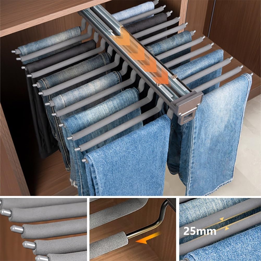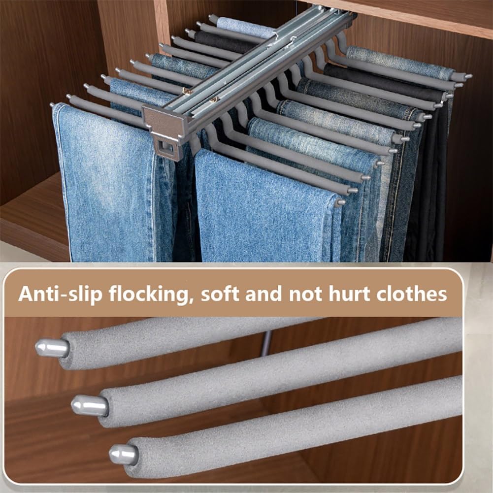 • Multifunctional: trouser hanger rod is suitable for trousers, scarves, jeans, clothes, etc., put it in cloakroom, wardrobe, bedroom, bathroom to maximise the use of space and make your room neat and tidy