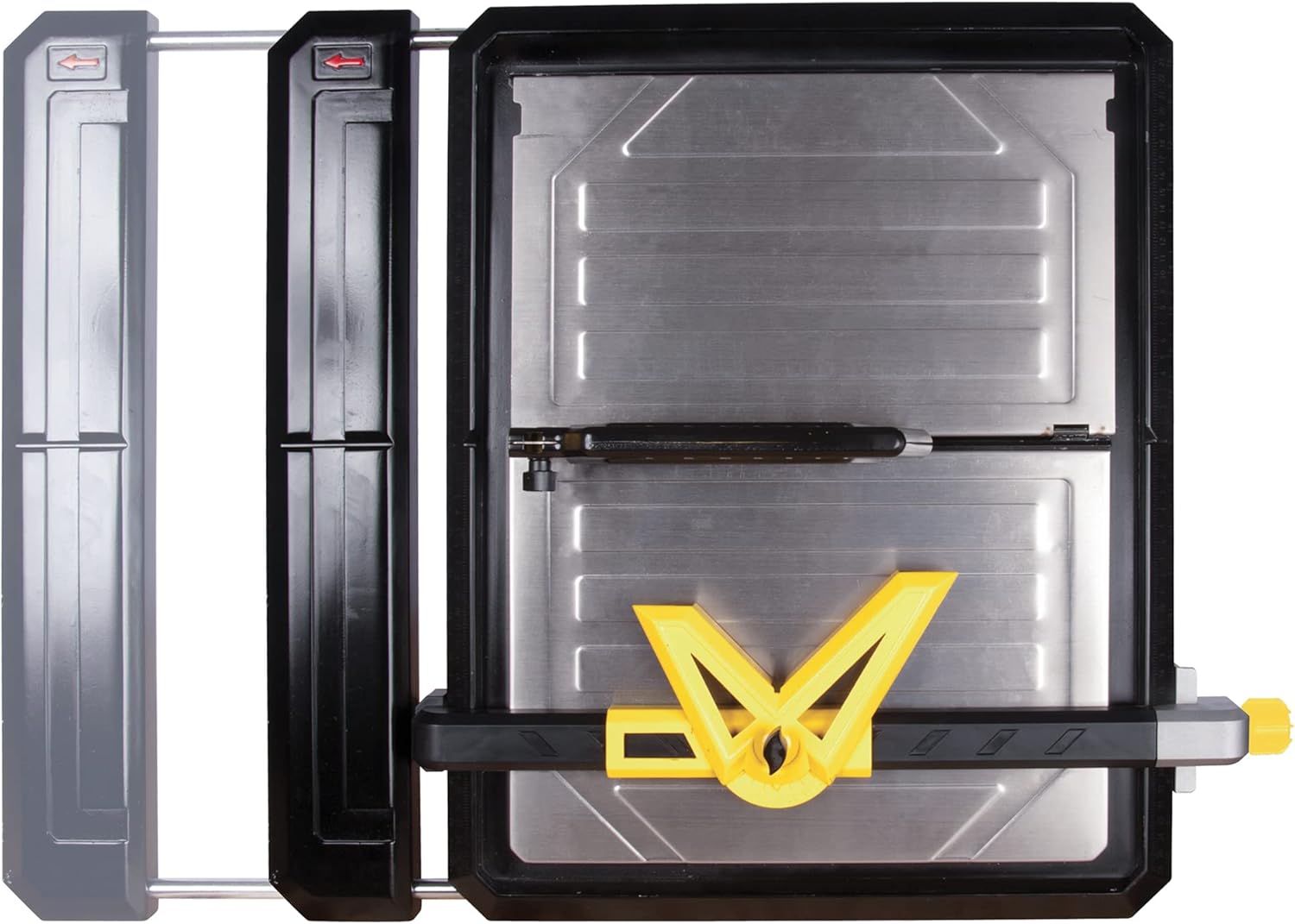 The QEP 7 in. Wet Tile Saw is the only wet tile saw in its class to offer a rear extension to support large format tile where you need it after the cut is performed. Once the tile is cut, the rear table extension keeps the cut tile safe and secure. The powerful 3/4 peak HP motor will cut through unlimited sizes of the hardest tile including ceramic, porcelain, slate, marble and stone. Convenient flip up table for 22.5Degree and 45Degree miter cuts, adjustable rip guide and angle guide for a variety of cuts. Water spray containment baffle to help keep the surrounding area drier during cutting.