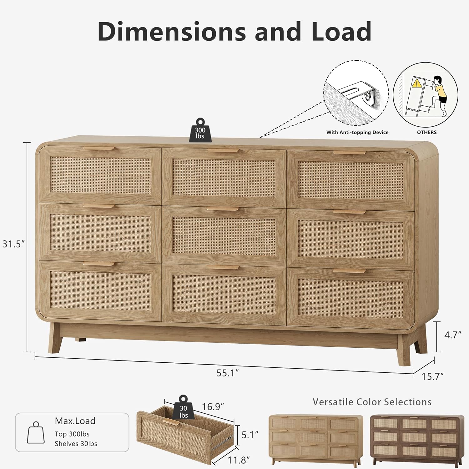 | Size | 15.7"D x 55.1"W x 31.5"H (9 Drawers) |