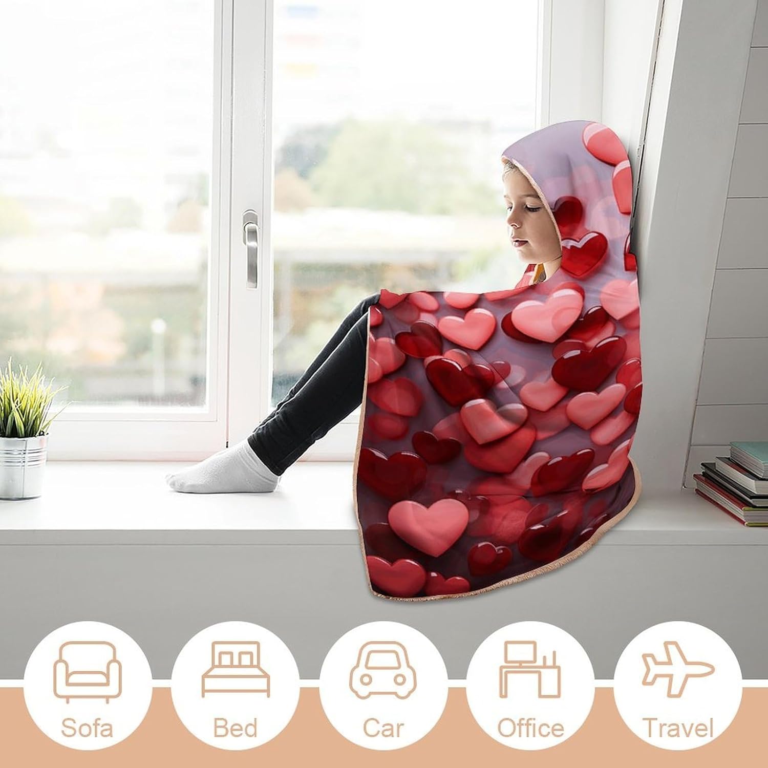 Wrap yourself in luxury with our Wearable Hooded Blanket!PREMIUM MATERIAL:Crafted from premium arctic velvet, this reversible blanket combines ultra-softness with durability. The smooth, non-shedding surface and flesh-pink interior feel gentle against your skin, while the breathable fabric ensures comfort without overheating.PRACTICAL BLANKET:Designed for convenience, the attached hood stays secure without dragging, making it easy to move around while staying cozy. Whether you're reading on the sofa, camping outdoors, gaming with friends, or napping, this wearable cloak blankets you in warmth wherever you go.DURABLE & SKIN-FRIENDLY:Meticulously stitched with vibrant colors, this Red Hearts blanket retains softness and shape after washing. No bleach required. Designed for everyday use.EXQUISITE WORKMANSHIP:Delicate stitching, high-definition printing and dyeing, clear patterns, bright colors, no fading, many choices, it is warm and beautiful when worn on the body.WARM GIFT:This super soft cloak blanket is specially designed for intimate love, loved ones, friends gift for Christmas Thanksgiving gifts, beautiful and soft blanket is to bring them warmth, joy and love feeling.EASY MAINTENANCE:Machine washable (cold water) for hassle-free cleaning, it retains its vibrant color and plush texture wash after wash. Embrace versatility and comfort.Size:40 inches x 50 inches / 100cm x 130cm50 inches x 60 inches / 130cm x 150cm60 inches x 80 inches / 150cm x 200cmI wish you a pleasant shopping experience!