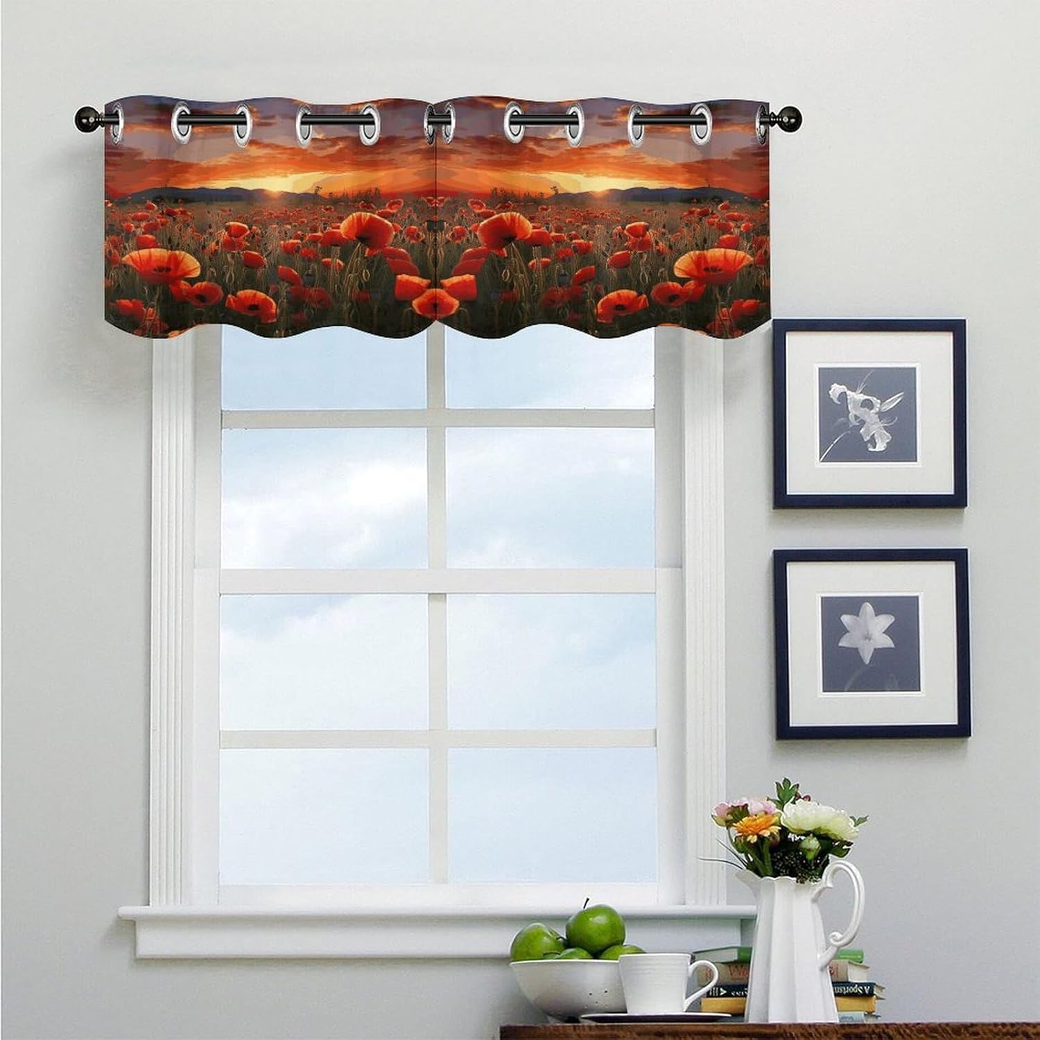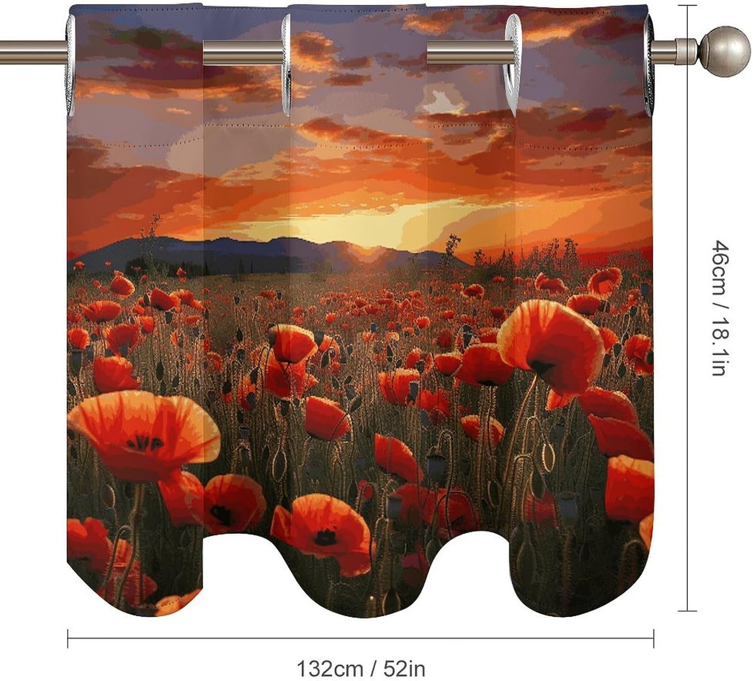 Perfect Pair Printed Curtain - Red Poppy Flower Field in Sunset Light Filtering Modern Window Décor Elevate your windows with our beautifully designed two-piece Red Poppy Flower Field in Sunset curtain set, combining a functional printed curtain with an elegant coordinating valance. Crafted for versatility, this Red Poppy Flower Field in SunsetCurtain is the ideal solution for adding privacy, style, and controlled light to any room. Premium Fabric & Modern Design: Crafted from premium fabric, this Red Poppy Flower Field in Sunset Curtain maintains a soft hand-feel and a graceful drape over time. The elegant print and smooth texture provide a sophisticated look that enhances your home's ambiance. Optimal Light Filtering & Protection: This Red Poppy Flower Field in Sunset modern curtain effectively filters harsh sunlight, creating a softly illuminated and comfortable atmosphere. It helps protect your furniture and flooring from UV damage while providing a good level of privacy. The fabric is resilient and designed for easy care. Versatile Application: This Red Poppy Flower Field in Sunset ready-to-hang Curtain is designed for broad compatibility. The curtain features standard 4.5cm grommets for smooth gliding on most curtain rods. With dimensions of 52" W x 18.1" H per panel, it's perfectly suited for various window styles. Ideal as a charming kitchen curtain or cafe curtain for bottom-up coverage, it also functions perfectly as a tier curtain. Whether you're looking for a stylish printed curtain for your living space, a functional light filtering curtain for a bedroom, or a complete look with a curtain valance, this Red Poppy Flower Field in Sunset set delivers both style and purpose. Set Includes: Two printed curtain panels Bring a cohesive and stylish upgrade to your home with this Red Poppy Flower Field in Sunset versatile curtain .
