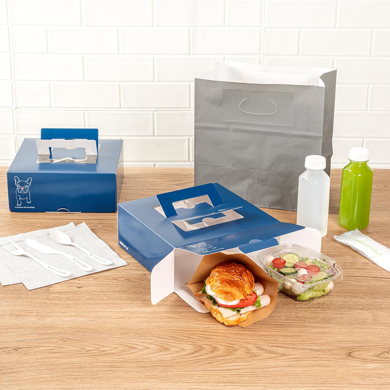 Efficiently deliver lunch or dessert orders in style with our Cater Tek Square Frenchie Paper Cake / Lunch Box. Crafted from durable paper, these disposable cake boxes can easily hold heavy meals or desserts without bending or collapsing. Featuring pop-up handles, these cake boxes provide employees with a secure and comfortable grip on orders. The handy viewing window of these catering boxes helps staff swiftly identify box contents without needing to open it. These disposable lunch containers feature a grease-impermeable coating that keeps buttery cake icings or oily dishes from causing messes. The attractive Frenchie design of these paper pie boxes complements the packaging at your bakery, cafe, or restaurant. These paper lunch boxes are shipped flat for space-saving storage in your pantry and can be easily assembled. Each paper cake box measures 9 inches in length by 9 inches in width by 3.5 inches in height. Shipped in a 50 count box.