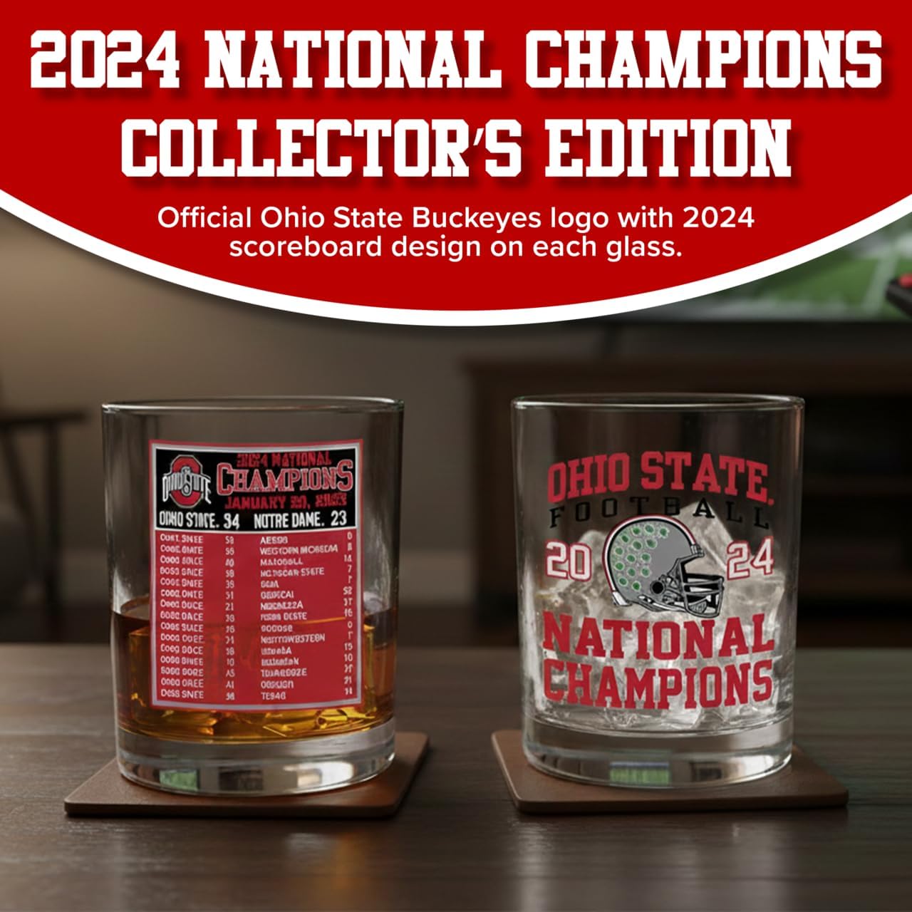 Celebrate the Ohio State Buckeyes’ 2024 NCAA National Championship with this officially licensed 14 oz rock and beverage glass set. Each glass proudly displays the official championship logo on the front, while the back features the final game scoreboard in Ohio State’s official team colors. Whether you're sipping on bourbon, whiskey, a cocktail, or even orange juice, these versatile glasses enhance any drinking experience. These high-quality, heavyweight collector’s glasses offer durability and a premium feel, perfect for both display and everyday use. Designed to be dishwasher safe, they provide easy maintenance without sacrificing quality. Whether you're an Ohio State alum, die-hard fan, or collector, this limited-edition championship glass set is a must-have to commemorate the Buckeyes’ victory. Secure yours today and show off your Buckeye pride!