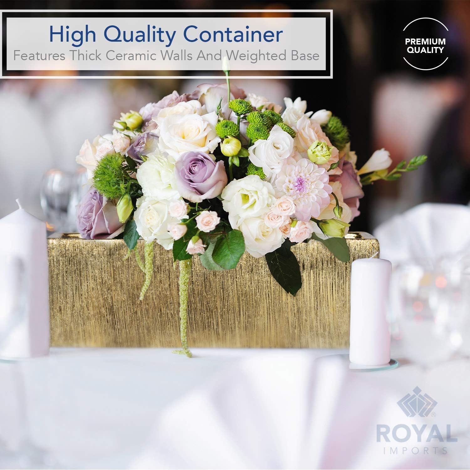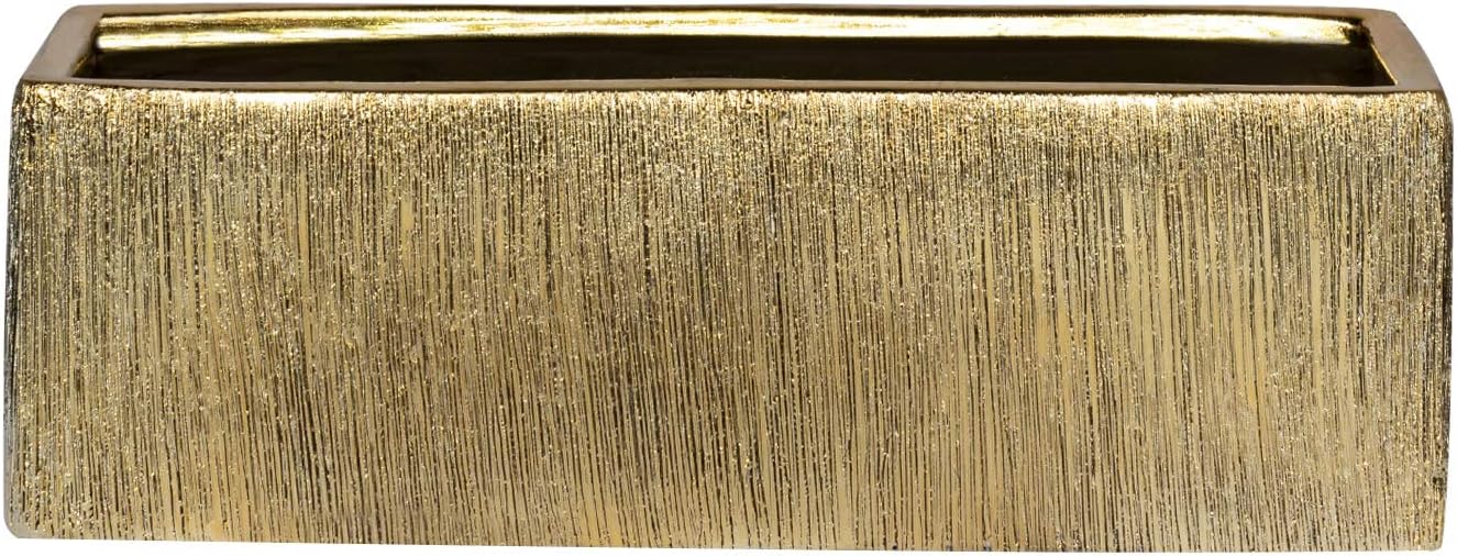 Decorate your home or special event with this gold ceramic low rectangle flower vase by Royal Imports. This 4" x 12" modern rectangular holder can also be used empty as a stand-alone decorative vase for your home. Unlike the standard cheap ceramic bowls, this ceramic vase is made of durable, fine, polished gold ceramic and enhanced with intricate etched grooves to add dimension and character. This metallic ceramic vase is hand crafted of best ceramic to create an attractive centerpiece for your table. As a vase it can be filled with an assortment of fresh flowers to create an eye-catching arangement. Or, it can be used as a bowl when filled with fruits or pastries. It can also be used as a planter when filled with house plantsRoyal Imports brings the best ceramics to the floral and craft industry. Each metallic ceramic cylinder is crafted of finest material you've come to expect of Royal Imports, thus creating a sleek, flawless centerpiece.Popular with:• event planners• florists• interior designers• restaurants• home decoratorsOverall Dimensions• Opening Width: 12"• Total Height: 4":: PLEASE NOTE: Individual Gold Vase shades may vary from Briliant Gold to Champagne Gold