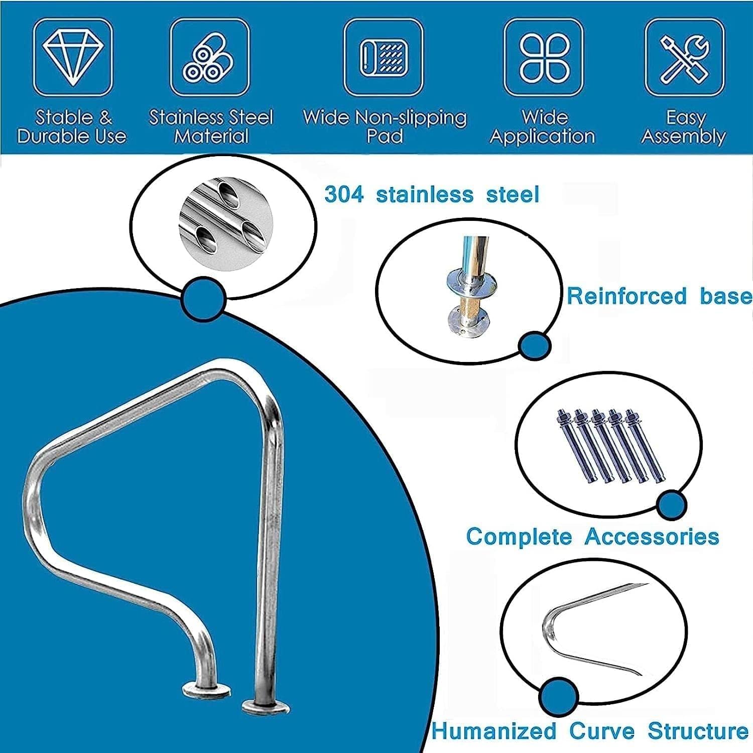 • Premium Material-Swimming Pool Handrail Made of 304 stainless steel, can be used for a long time, Metal polished surface, generous and beautiful, smooth lines,Its surface is smooth makes it easy to maintain, just wipe it with a damp towel to be as bright as new.