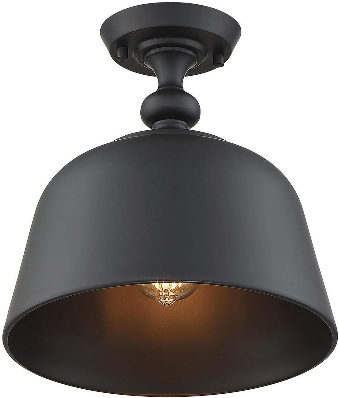 From Savoy House, this Berg 1-light ceiling semi-flush mount is a perfect blend of industrial style and traditional allure. It showcases an oversized metal shade that is finished in matte black, both inside and out, for a bright and focused glow. Above the shade, hardware details recall the curves of an elegant candlestick. Berg is perfect for times when you would like a more directed beam of light, such as in a small entryway or a kitchen. This fixture is 12" in width and 12" in height. Uses one standard size light bulb of up to 60 watts (not included).