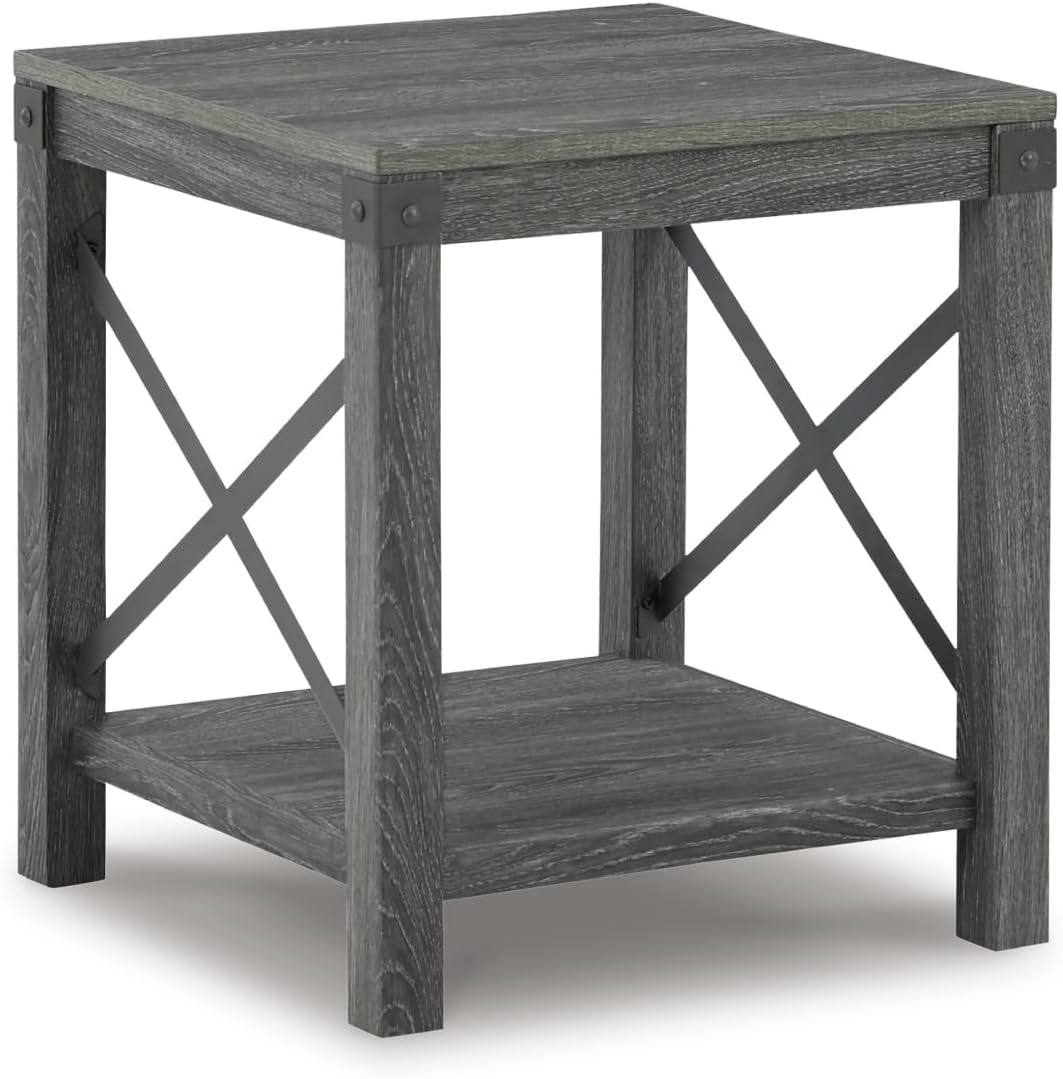 Sporting a distressed whitewash finish, the Carynhurst end table is rustic farmhouse living at its best. Crossbuck styling adds striking flair. Metal industrial brackets incorporate an industrial twist.