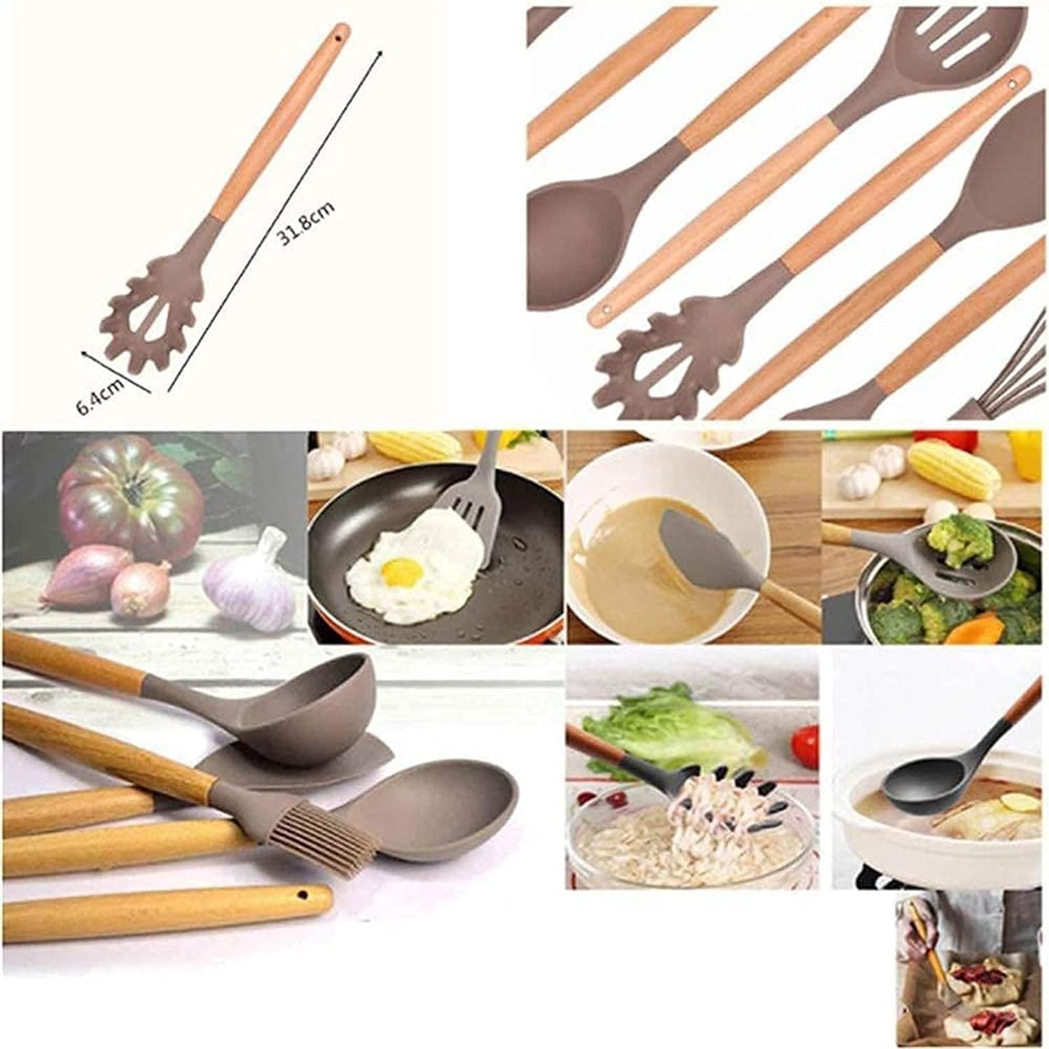 Kitchenware set, made of food contact material with comfortable grip and hanging hole design for easy storage, reassuring material. Kitchenware is easy to clean and helpful in cooking. It is also a skilled stir fryer, easy to pick up food, anti scalding and anti slip, lightweight and easy to use.Cooking utensil sets is a good gift for housewarming, birthday, Christmas, thanksgiving. Perfect for loved ones that like to cook, chefs, or even for your own personal use. If you are cooking enthusiasts, this cooking utensil set will be a good choice.Product name:Cooking Utensil SetsColour: As showMaterial: Silicone + WoodFeatures: Kitchenware is resistant to high temperature, durable, easy to clean, combination setPacking list:1*Leaky shovel1*leaky1*denser1*spaghetti 1*spoon1*spatula 1*silicone brush, 1*spatula1*whiskSelling point:Food grade silicone, baby-like careNo deformation, no damage to the pot, easy to clean, no cracking, soft materialNote: Light shooting and different displays may cause the color of the item in the picture a little different from the real thing,Thank you for your understanding. Please allow 1-3% error due to manual measurement.Please make sure you do not mind before you bid.After sales: Our products undergo a rigorous quality inspection, please rest assured to buy,Our products and services will not let you down, If you have any questions, feel free to contact us and we will provide you with the best service. thank you for your support to our store. I wish you and your loved ones good healt
