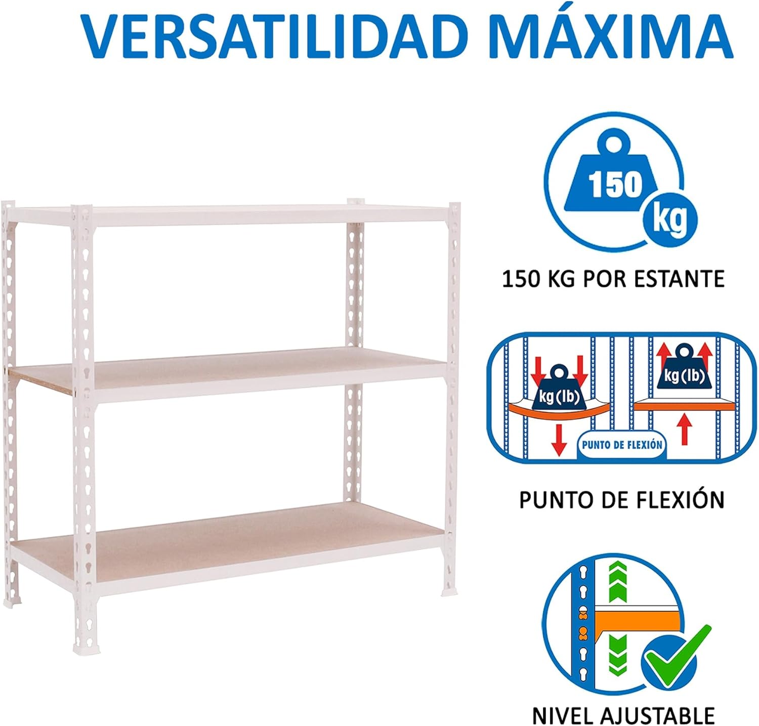 METAL SHELVING STORAGE - With the SimonRack screwless metal shelving unit create your space with its easier and faster mounting system. Wooden shelves for better aesthetics. They can be combined and assembled at different heights. Our shelves are stable and will not wobble once assembled so they do not need to be anchored to the wall. With free access to all shelves. Adapt to any need. Sturdy and durable, suitable for home and professional use. Suitable for garages, workshops, shops or warehouses. LOAD CAPACITY AND MEASUREMENTS IN USE - The metal shelving unit is 991x910x310 mm in height, width and length, and has 3 shelves. Its load capacity and FLEXING POINT is 150 kg on the central shelves, at the top and bottom it is 150 kg, which means that when removing the load the shelf recovers its original shape. CERTIFIED FLEXING POINT EASY ASSEMBLY - Visit our store for assembly videos. Includes illustrated assembly instructions (English language not guaranteed) which explains step by step how to do it. As this is a shelf without screw, only a nylon hammer is necessary for the correct fitting of the parts. 4 plastic feet are included in the product to prevent marking and rubbing the floor. You can mount each shelf to the height you need and can be mounted on both sides for different functionalities. EUROPEAN QUALITY - The steel used to comply with EN 10130 is DC 01 which allows recovery after bending suffered. The profiles of S325 steel with a thickness of 1.5 mm with a coating on the Z275 galvanized parts and the shelves are made of 12 mm thick chipboard. MANUFACTURING SPANISH - All SimonRack products are manufactured in Spain and have a 5 year warranty.