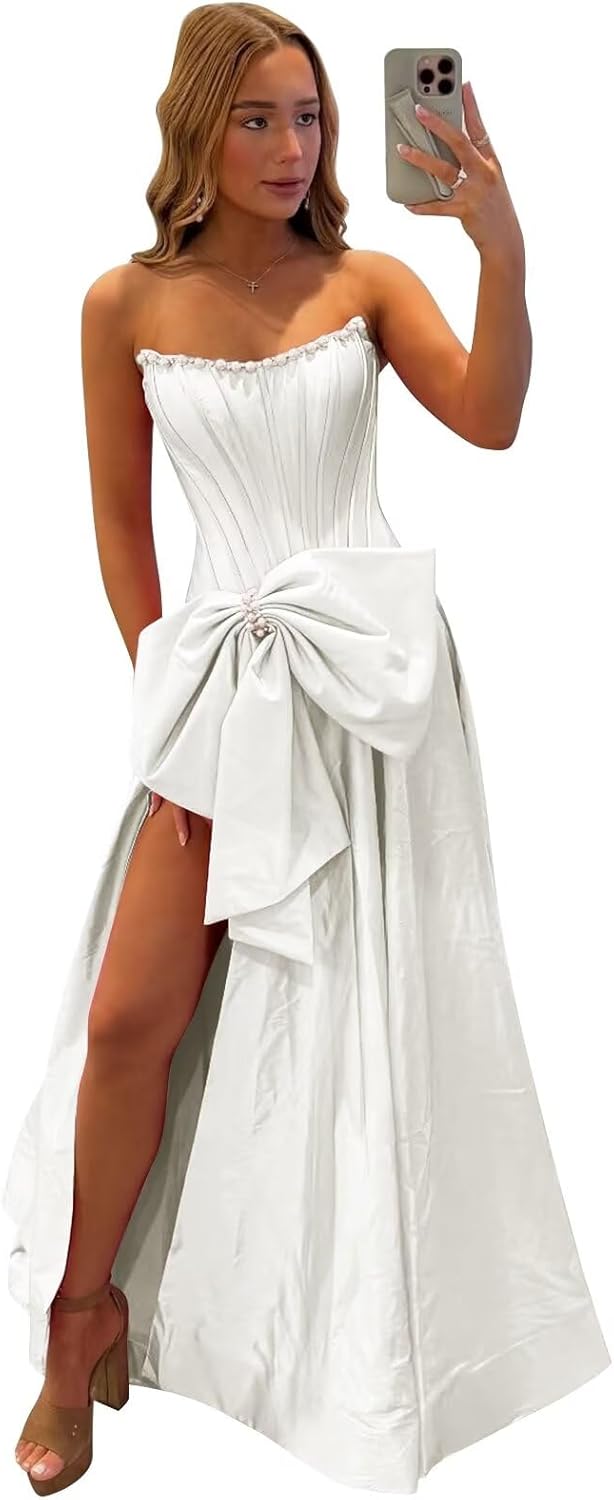 | Fabric Type | Satin Prom Dresses For Teens 2026 Pearl Strapless Evening Gown Bow Formal Long Pageant Dress With Slit Black US00 |