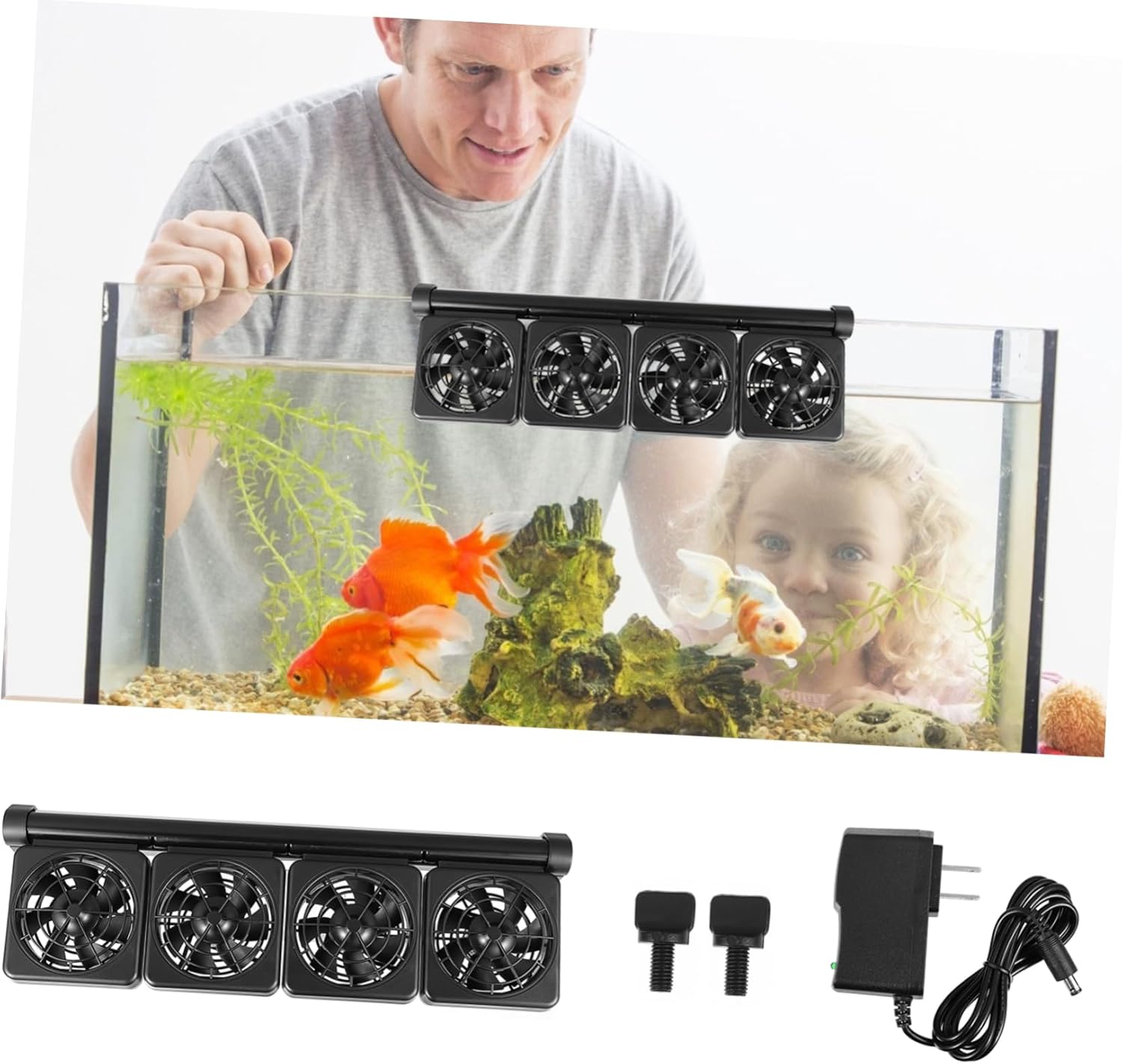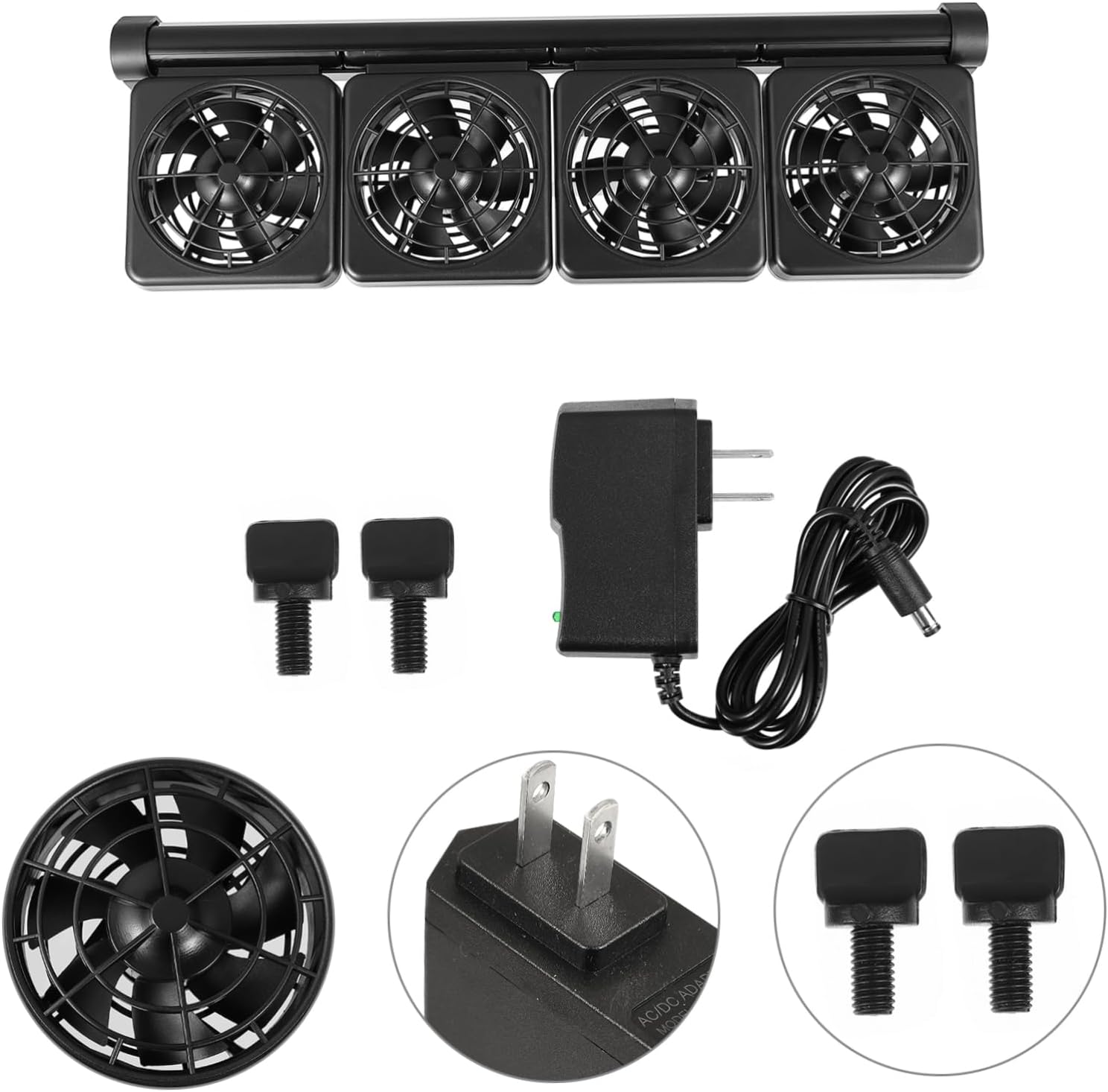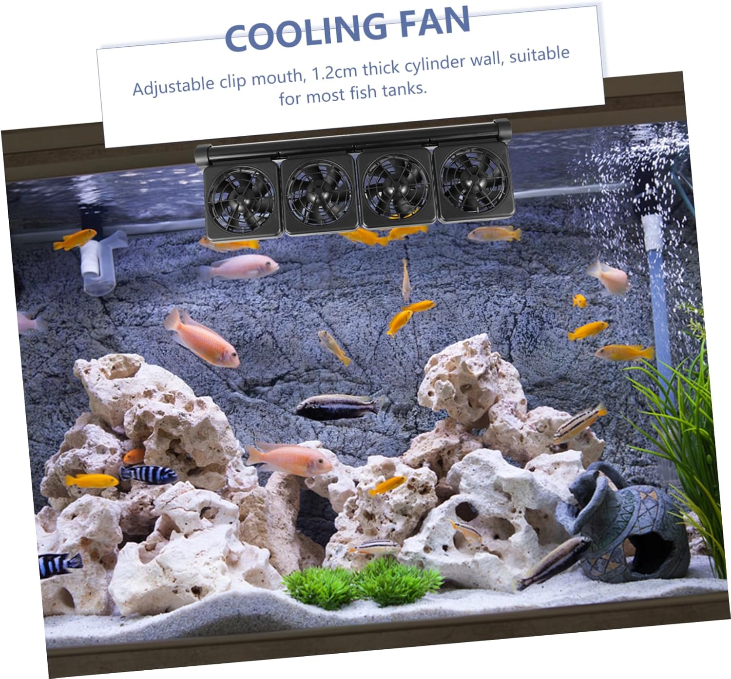 Package List 1 x Aquarium Chiller 1 x power adapter 2 x screws Characteristics -Color: Black Cooling Fan System for Aquarium -Material: plastic, aluminum alloy Aquarium Fan Adapter Voltage Output: 12V Fish Tank Fan -Adapter Voltage Input: AC110V Adjustable Aquarium Chiller Cable length: 120cm Fish Tank Cooling Fan -Size: 39.50X12.00X7.00cm/15.52X4.72X2.75in Fish Tank Supplies Power: 4 x 1.9W Fan System for Fish Tank - It is suitable for saltwater or freshwater aquarium and fish tank Fan for Fresh Water - Angle adjustable and low noise operation,this fan is to use 4-Head Fish Tank Cooling System - No need for tool to install, just clip itonto the fish tank wall Aquarium Cooling Fan. - Provide better ventilation to reduce heatcoming from aquarium equipment Aquarium Chiller - This cooling fan is compatible with lessor equal to 1.2 cm thickness and more than 40 cm long glass tank wall Fan for Salt WaterGoods DescriptionFish Tank Cold Wind Chiller It is made of good plastic material, to use.Aquarium Fan This is an adjustable aquarium cooling fan.Fan System for Fish Tank 100 degree adjustable and2 gears wind adjustable can provide multipurpose tool for your fish aquarium
