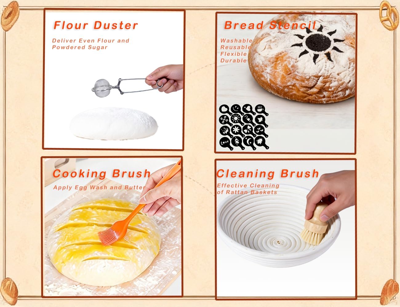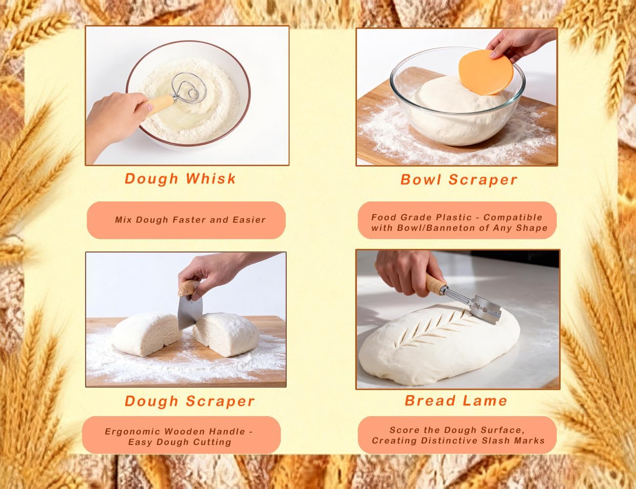 | Included Components | 10In Round Proofing Basket, 9In Oval Proofing Basket, Sourdough Starter Jar, Silicone Spatula, Dough Whisk, Bread Lame, Blade Cover, Bowl Scraper, Stainless Steel Scraper, Flour Duster, Silicone Bread Sling, Cooking Brush, Bread Stencils, Bread Bags, Reusable Bread Bag, User Manual |