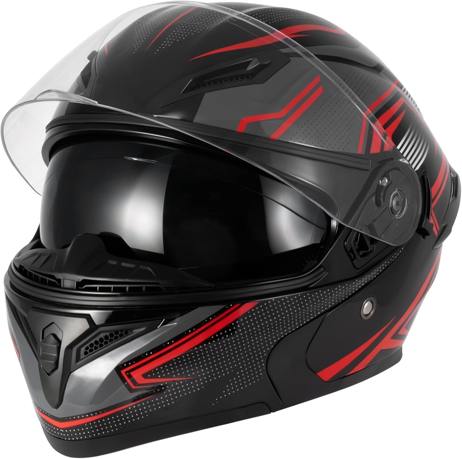 Elevate your ride with the Spark Adult Flip-Up Motorcycle Helmet, where superior protection meets versatile design. DOT-certified for uncompromised safety, its full-face flip-up structure offers dual-mode flexibility—sealed riding clarity or effortless open-face ventilation. The integrated dual visor combats glare with a sunshield while maintaining panoramic visibility. Engineered with lightweight ABS shell, it reduces neck strain during long commutes or tours. The quick-release buckle ensures secure, one-handed operation. Inside, moisture-wicking liner and enhanced airflow channels keep you cool and focused. Ideal for daily travel and adventures, it includes: helmet x1, clear visor x1, sun visor x1, manual x1. Ride confident, ride smart.
