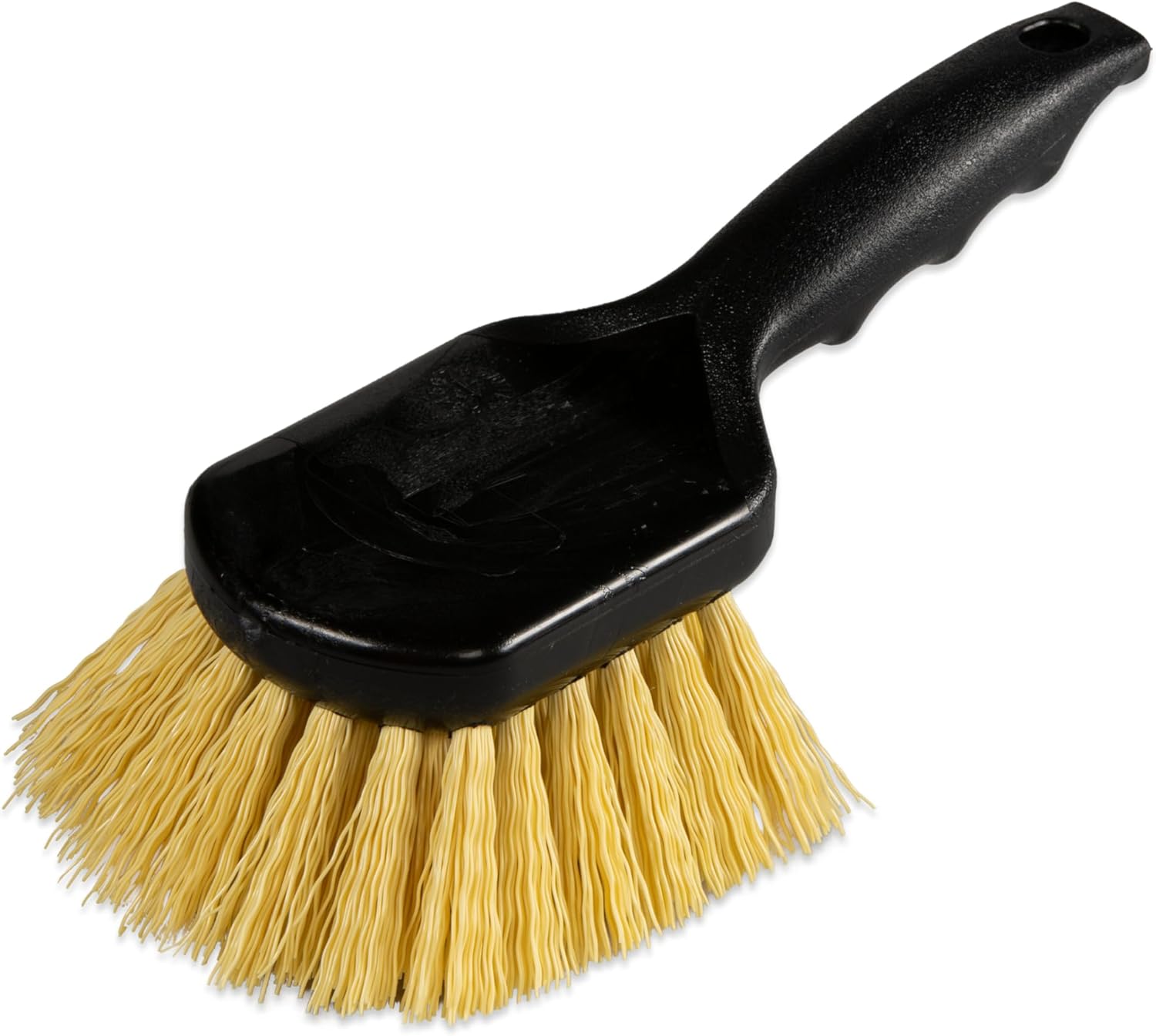 The Carlisle 3650500 Sparta utility scrub brush with cream-colored bristles has a long handle for grip and control when cleaning in industrial, healthcare, and other general use applications. The block and handle are black and made of lightweight plastic for water and break resistance. The 2"-long polypropylene bristles are chemical and water resistant and are crimped to hold solution. All brush material is free of BPA (Bisphenol A) to address safety concerns raised by the U.S. FDA and other organizations. The overall dimensions are 8-1/2 x 3 inches (length x width).Carlisle manufactures food service equipment and supplies and sanitary maintenance tools and supplies for commercial, industrial, and institutional facilities. The company, founded in 1954, is headquartered in Oklahoma City, OK.