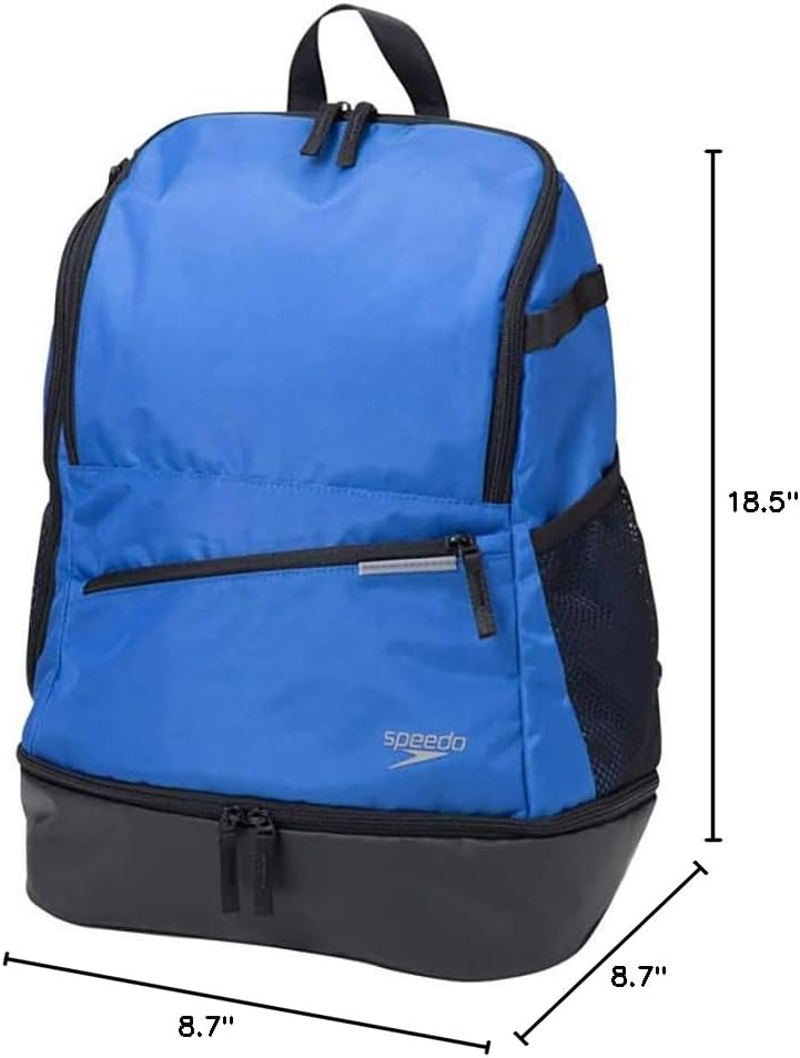 This is a swimmer's backpack that will delight swimmers with a lot of luggage. The fully open main zipper opens wide and allows for easy access to training gear. Includes bottle cooler pocket to keep drinks hot In addition, it has ample storage capacity for easy organization such as small side pockets for storing notes and pens, shoe pockets on the bottom, and mesh pockets. The Speedo exclusive back cushion is designed to reduce fatigue even when carrying heavy loads. Freestanding for easy access The surface of the backpack is made with highly visible reflective tape and reflective logo. The front pocket can also be printed with your team name.