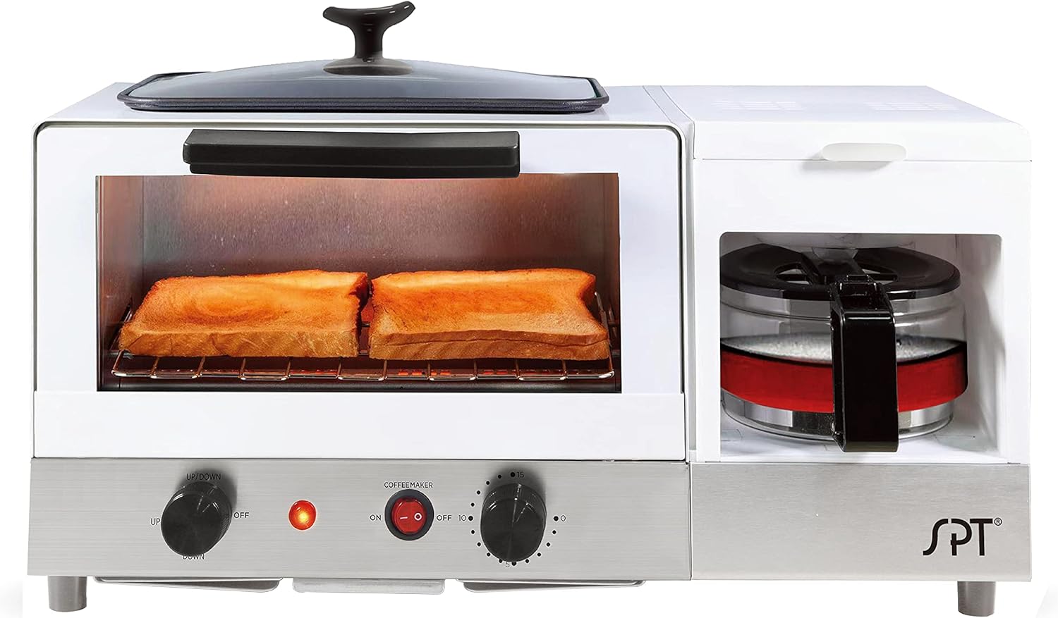SPT 3-in-1 Breakfast Maker combines all the breakfast necessities into one: Toaster Oven, Coffee Maker and Oven-Top Griddle. The new white cabinet with stainless steel control panel gives it a modern and sleek look. This is the perfect compact appliance for dorms, offices, RV’s, studios or wherever space is limited. You can brew a fresh cup of coffee, toast couple slices of bread and fry up an egg all at once!