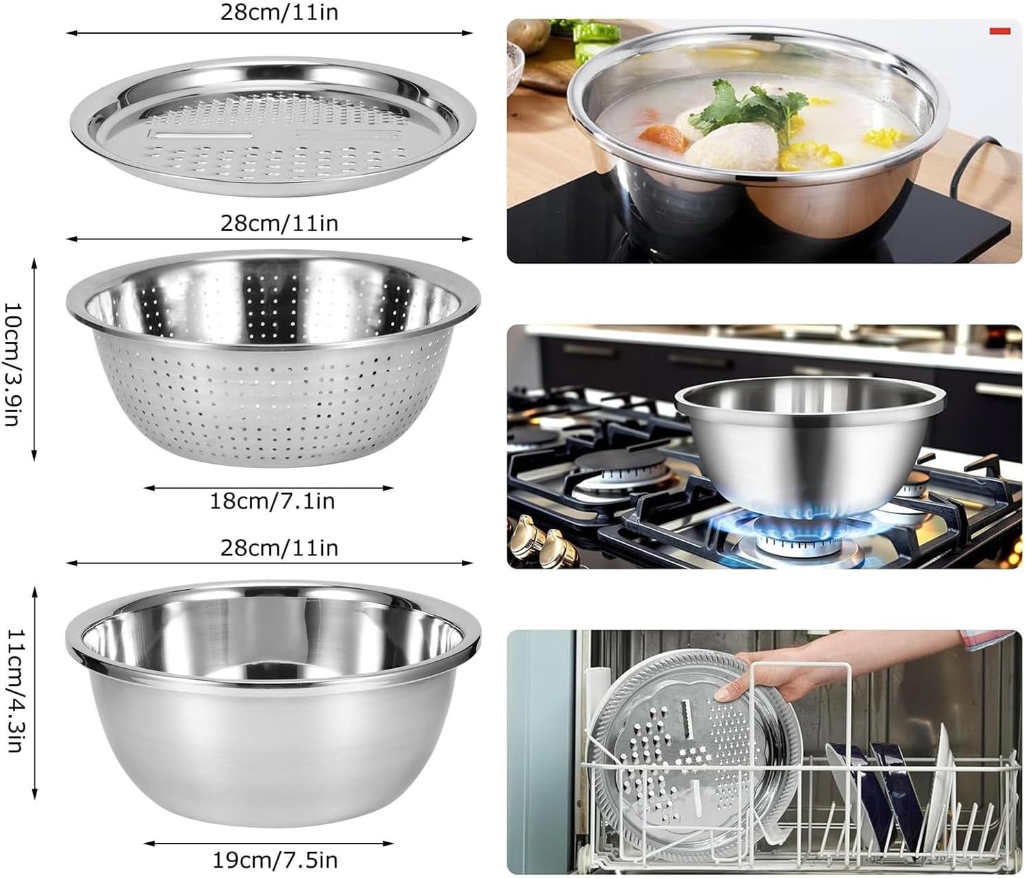 Mixing Bowls, Stainless Steel Nesting Bowl Set For Space Saving Storage, Ideal For Cooking, Baking, Prepping & Food Storage【Feature】1.Smooth Surface, Not Easy To Leave Stains, Can Be Easily Cleaned, Stacking Design Saves Space.2.Adopting Food-Grade 304 Stainless Steel, Corrosion-Resistant, High Temperature-Resistant, Healthy And Environmentally Friendly, With A Long Service Life.3.Easy To Clean. Freezer Safe. Dishwasher Safe.Hese Prep Bowls Can Also Be Used As Salad Bowls And Other Serving Dishes.4.With A Sleek And Fashionable Appearance, Our Mixing Bowls Do Not Contain Chemicals Found In Plastic And Other Materials Making Them A Healthy And Smart Alternative.【Specifications】:Name: Germany Multifunctional Stainless Steel BasinMaterial: Stainless SteelProduct Size:26cm Size: About 26*26*11cm/10.24*10.24*4.33in28cm Size: About 28*28*11cm/11.02*11.02*4.33in30cm Size: About 30*30*11cm/11.8*11.8*4.33in【Package Includes】:Drain Tray*1+ Grater*1+ Stainless Steel Basin*11x Cleaning Cloth 2 X Scrub Sponge Dish Cleaner Pad1x Rubber Gloves【Notes】:1. Size Information Is Just For Reference Only, Please Allow 1-2cm (0.4-0.8") Differences Due To Manual Measurement, Thanks.2. Item Color Displayed In Photos May Be Showing Slightly Different On Your Monitor Since Monitors Are Not Calibrated The Same.