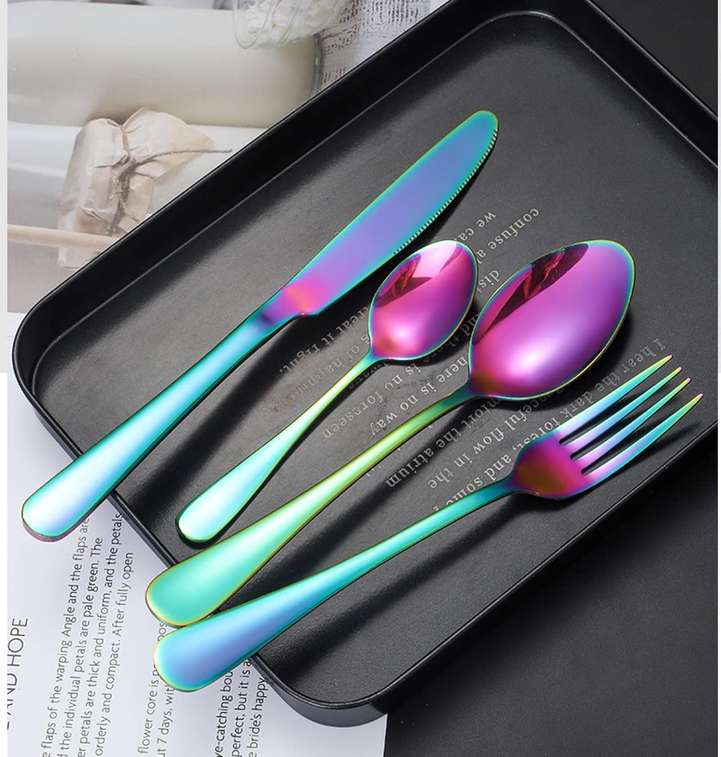 Product category: knife and fork, spoon, chopstick set stainless steel material: 410 material polishing process: cloth wheel polishing (mirror polishing) suitable for gift occasions: public relations planning, wedding gifts, holiday gifts Material: stainless steel set list: knife fork spoon Golden wooden box packaging specifications: set size per set: 34.3*25.3*4.5cm weight per set: 1830g Product list: dinner knife * 6 dinner spoon *6 dinner fork* 6 coffee spoons *6=24PCS