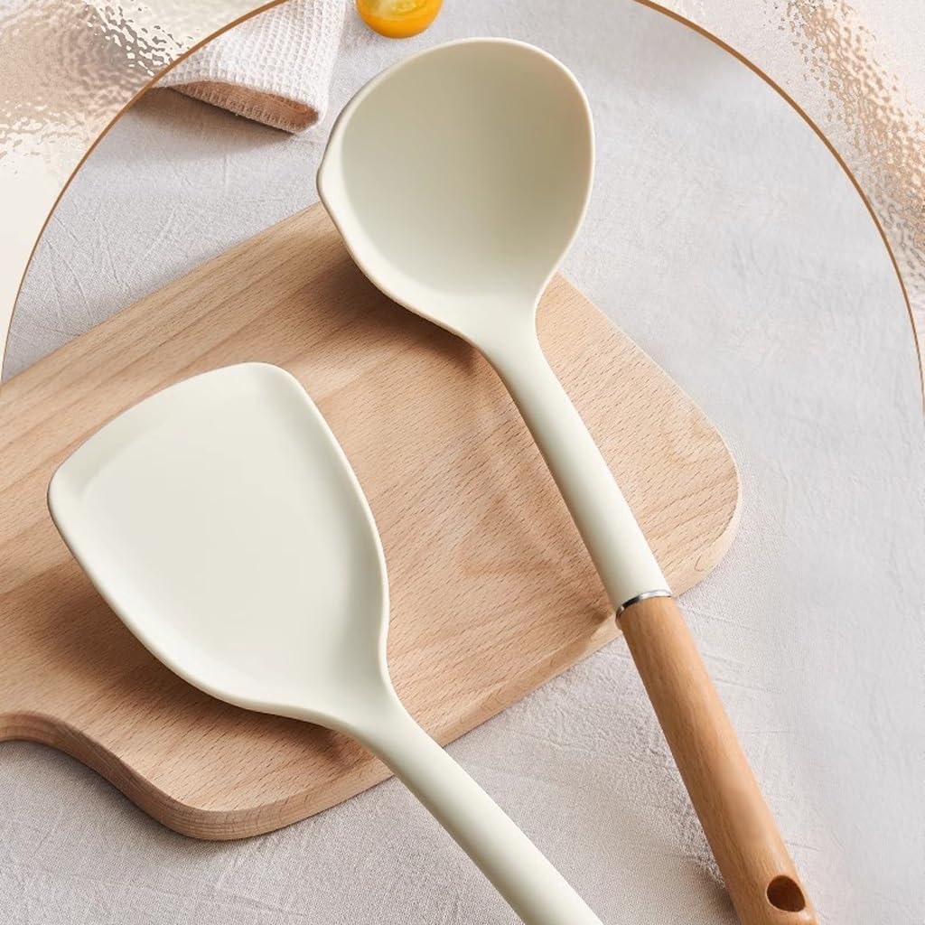 Soft, heat-resistant, and scald resistant inner core color, as well as high-strength nylon material, are and not deformed at high temperatures.Smooth and soft silicone, which will not scratch the surface of the pot during use, can effectively protect the pot body.The wrapped nylon core has toughness and is not afraid of breakage, resulting in a longer service life.Flexible and not damaging the pot, resistant to high temperatures, fully unleashing your culinary skills.Comfortable grip, fits the palm of the hand, and is not afraid of stir frying or hot oil testing.Name: Kitchen utensils, shovels, spoonsMaterial: Soft siliconeColor: As shown in the pictureNumber of pieces: 2Specification: Kitchen utensils, shovels, spoons * 1 set1. Due to screen display differences, there may be slight color differences in the visual system. Please refer to the product received.2. Manual measurement may have slight errors, please understand.