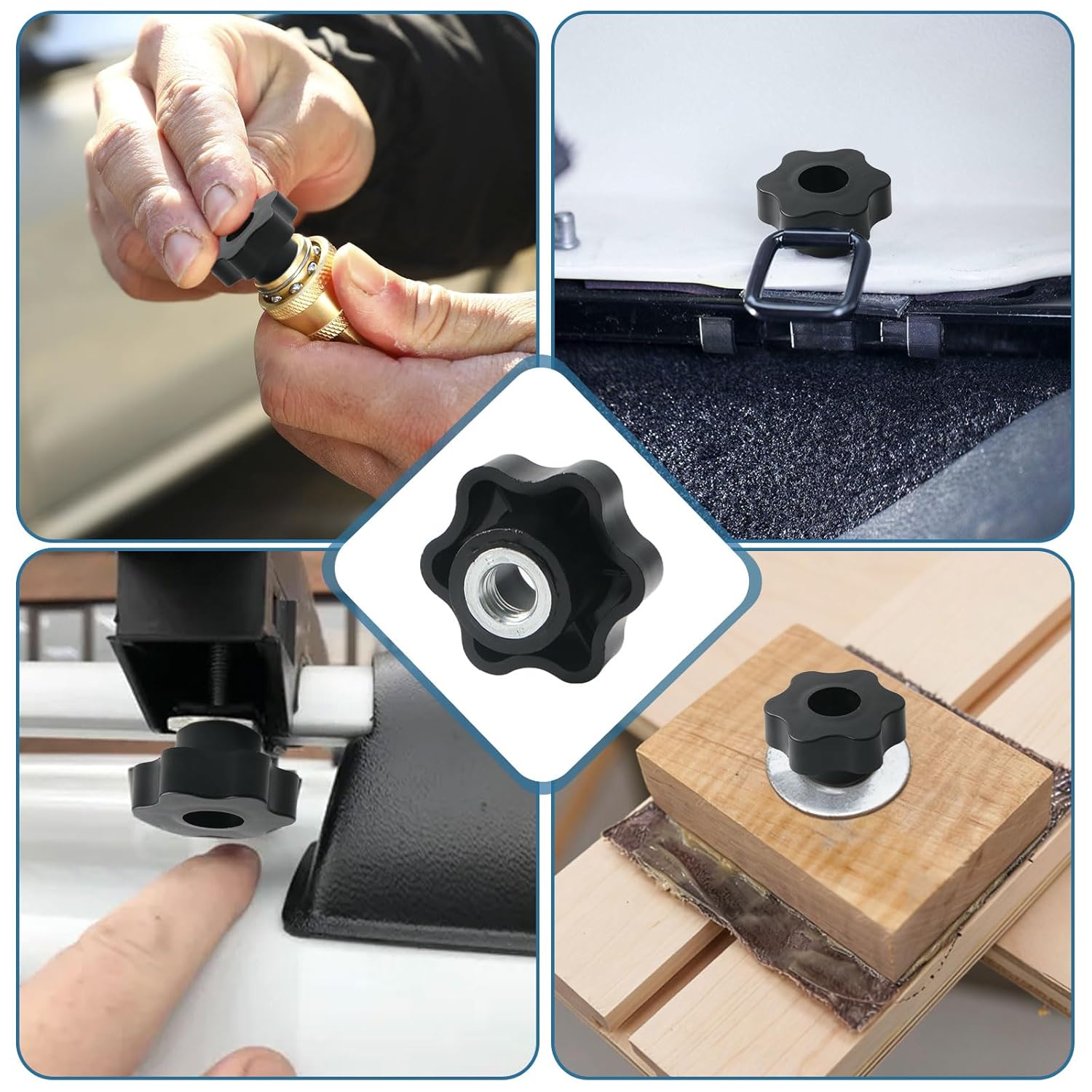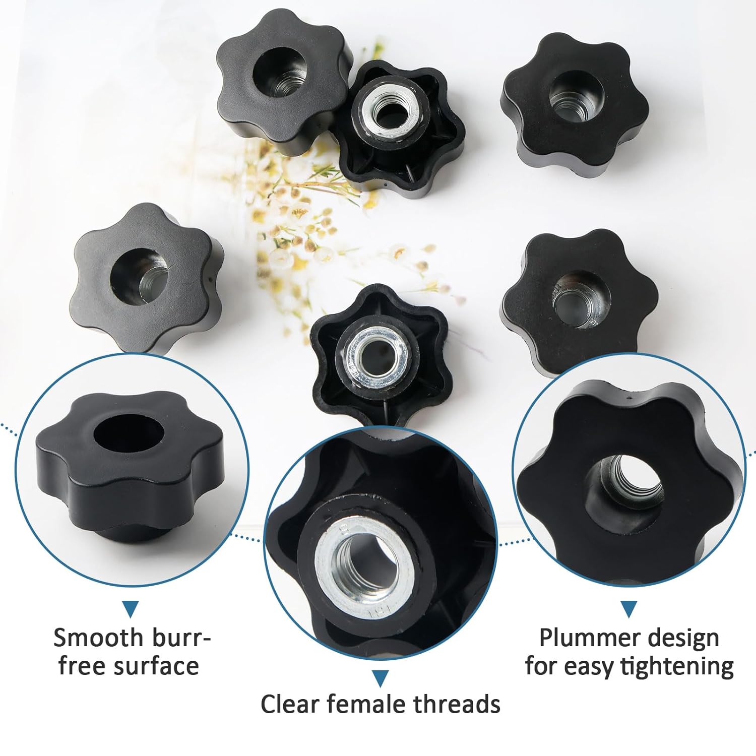 Pack of 12 Star Grip Nuts M12 Star Clamping Nuts Knurled Nut Outer Diameter 48 mm Star Handle Toggle Nut Lockable Star Nut Tension Knob Star Clamping Nuts Wing Nut Black Star Grip Nut Internal Thread Galvanised Iron for Machines and Systems, Furniture, Machine Tools, Fitness Equipment. Features: -- The star grip nut M12 is made of plastic and iron materials, which are durable and have a long service life. -- The M12 knurled nut is free of edges and burrs, but also enhances the appearance of the devices thanks to its attractive design. -- The M12 wing nut features a through hole design with clean and clear threads, providing a comfortable, non-slip grip and easy tightening by hand. -- Wing nuts allow for easy assembly, disassembly and adjustment. It is widely used in mechanical engineering, furniture decoration and industrial equipment requiring insulation and frequent disassembly and maintenance. Specifications: Product Name: Star Grip Nut M12 Material: Galvanized Iron, Plastic Color: Black Size: M12 female thread, head diameter 48mm. Shape: Star Shape Package Content: 12 x M12 Star Clamping Nuts Warm tips: 1. Please allow 1-2cm differs due to manual measurement. 2. Please allow slight color difference due to different screen resolutions.