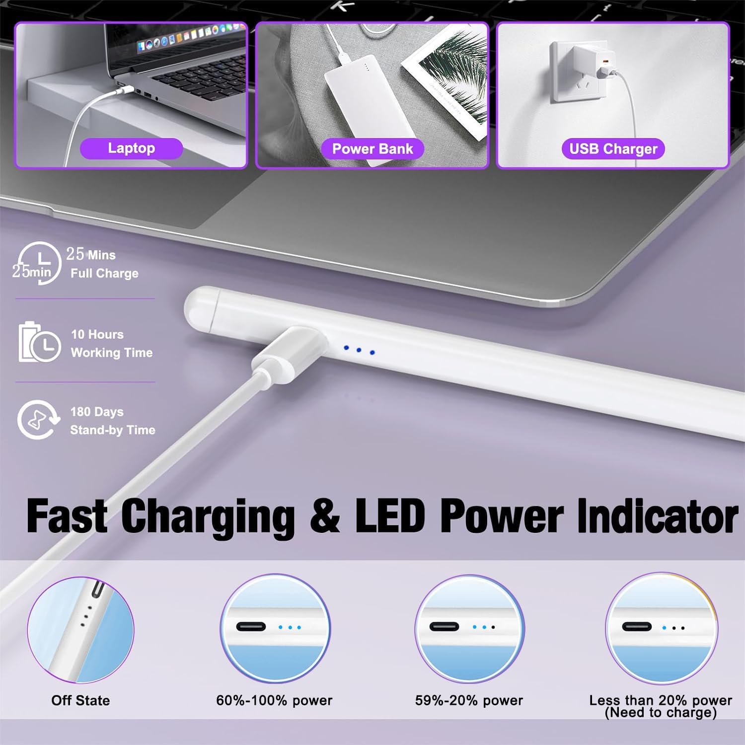 {2Pack}Stylus Pencil Designed Specifically for iPad,Support Palm Rejection,Magnets,Power Display,No Lag/Offset/Breaking PointHow to useDouble-click the top to ON/OFF can be used.Tilt SensitivitySmoothly draw lines of different thickness by adjusting the angle your write.Palm RejectionDon't need to lift your hand while you are writing or drawing,can naturally rest your hand on screen.Magnetic absorptionDouble stronger magnetic attraction, firmly attach to your iPad.Doesn't Support Wireless Charging.✍Only Compatible 2018-2026 iPad ModeliPad 11th Gen A16 (2025)iPad 10th Gen (2022)iPad 9th Gen (2021)iPad 8th Gen (2020)iPad 7th Gen (2019)iPad 6th Gen (2018)iPad Pro 13"M5 (2025)iPad Pro 11"M5 (2025)iPad Pro 13"M4 (2024)iPad Pro 11"M4 (2024)iPad Pro 12.9"6th Gen (2022)iPad Pro 12.9"5th Gen (2021)iPad Pro 12.9"4th Gen (2020)iPad Pro 12.9"3rd Gen (2018)iPad Pro 11"4th Gen (2022)iPad Pro 11"3rd Gen (2021)iPad Pro 11"2nd Gen (2020)iPad Pro 11"1st Gen (2018)iPad Air 13"M4 (2026)iPad Air 11"M4(2026)iPad Air 13"M3 (2025)iPad Air 11"M3 (2025)iPad Air 13"M2 (2024)iPad Air 11"M2 (2024)iPad Air 5th Gen (2022)iPad Air 4th Gen (2020)iPad Air 3rd Gen (2019)iPad Mini 7th Gen/A17 Pro (2024)iPad Mini 6th Gen (2021)iPad Mini 5th (2019)What You Get2Pack Stylus Pencil for iPad6Pack Replacement Nib2Pack USB-C Cable2Pack Instruction Manual