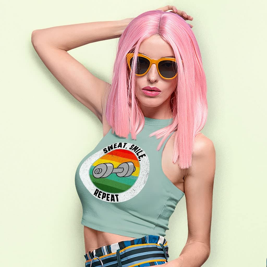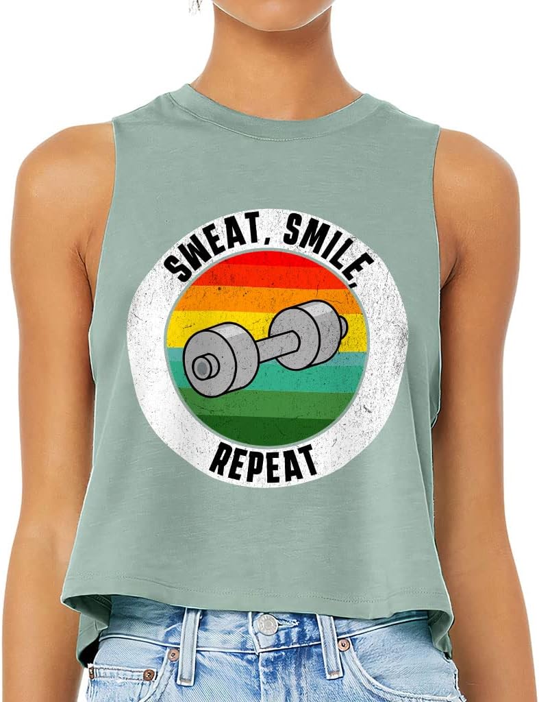 Cute and flattering Sweat Smile Repeat Racerback Cropped Tank is suitable for most indoor or outdoor activities, such as gym, yoga, running, hiking, beach or relaxing around the house. Pair Funny Women's Tank with your favorite sports bras, especially strappy ones, and high-waisted leggings, then you will enjoy cool and comfortable exercise throughout the summer.