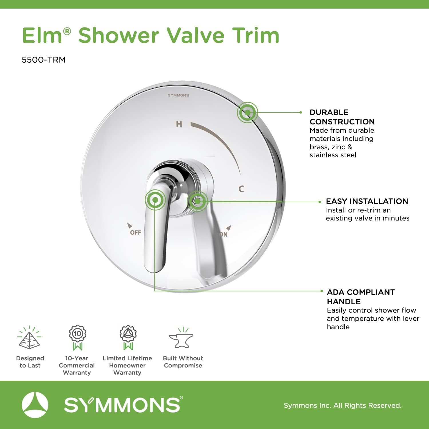 The Symmons Elm Collection blends sleek form with an organic design. Built from sturdy materials and plated in an abrasion resistant finish over solid metal, this Elm trim kit includes an escutcheon and lever handle. The ADA compliant lever can be turned to the hot and cold indicators on the cover plate to adjust the water temperature. With this this shower valve trim, there's no need to replace your existing valve because this kit includes everything required for an easy installation over the valve. It also backed by the Symmons technical support team and a lifetime limited consumer warranty.