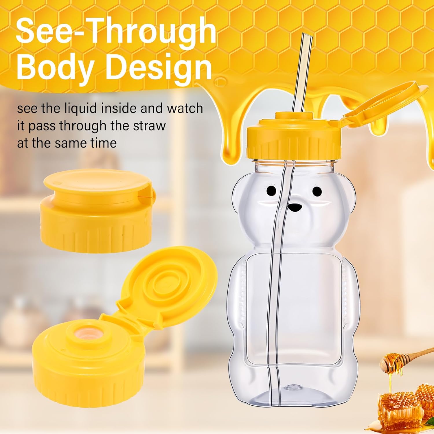 Features: The bear honey bottles squeeze can ensure that your honey or syrup maintains its natural freshness and flavor, and you can apply them for kitchen, dining room, restaurant, cafe, camping, picnic, and barbecue. The bear shaped jars can store water, juice, milk, syrup, essential oils, sugar, flour and other beverages, at the same time, they are useful gifts for wedding, birthday, baby shower, festival, beekeeper, mother, chef and more. Specifications: Material: plastic and siliconeColor: mainly yellow and clearSize: Total height: approx. 4.84 inchesLength: approx. 2.2 inches Width: about 2 inchesOpening diameter: about 1.46 inchesStraw: approx. 5.91 inches/ 15 cm in lengthCapacity: approx. 6 ozPackage includes: 64 x Plastic honey bear bottle64 x Long strawNotes: Manual measurement, please allow slight errors on size. The color may exist a slight difference due to different screen displays.