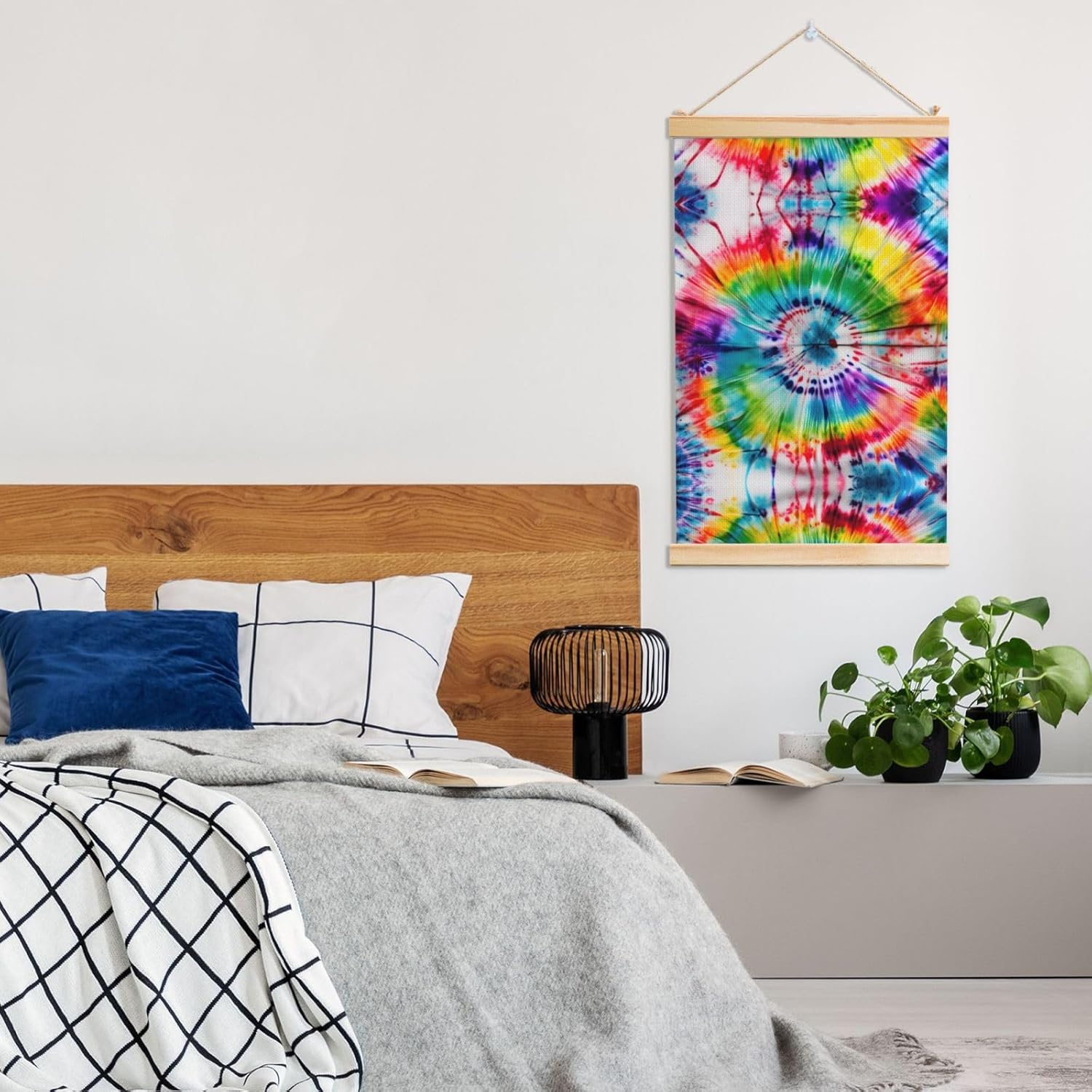 Our Tie Dye Hippies Print Wooden Poster Hanger Is An Excellent Addition To Your Home Decor Or A Perfect Gift For Friends And Family. Made Of Selected Quality Canvas With Brilliant And Enduring Colors, This Wall Art Is Designed To Resist Water, Dust, And Fading, Ensuring The Bright And Vibrant Art Lasts. The Polyester Is Enclosed Between Two Teak Wood Hanger Scrolls With An Attached 35cm Rope For Easy Hanging. Installation Is Made Simple With The Included Two Nails In A Plastic Box. The Modern Minimalist Style Of Our Wall Hanging Complements Any Home Decor, Elevating The Artistic Ambiance And Brightening Up The Room. Experience The Elegant Transformation This Wall Hanging Scroll Painting Brings To Your Spaces Today.