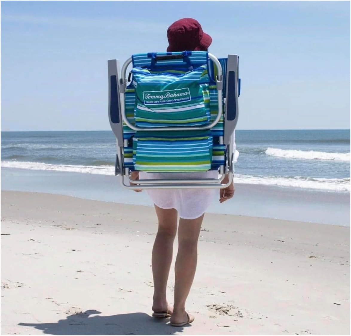 The Tommy Bahama 5-Position Backpack Beach Chair offers ultimate comfort with five reclining positions, including lay-flat, an adjustable pillow, and a sturdy aluminum frame with a 300 lb. capacity. Designed for convenience, it features a zippered insulated pouch, cup and phone holders, a towel bar, and safety locking hinges. Lightweight at 7.82 lbs, it folds flat with padded backpack straps for easy carrying. Perfect for beach days, camping, or poolside lounging, this 2-pack set combines durability, comfort, and portability.