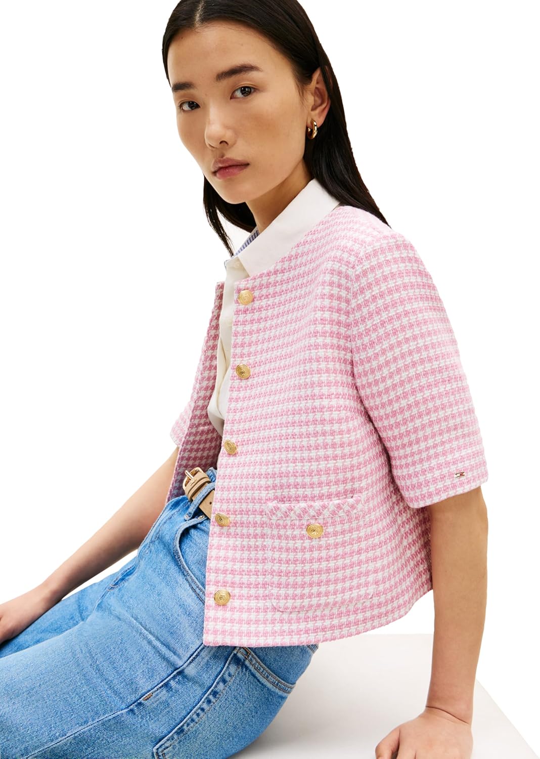 Introducing the Lightweight Short Sleeve Tweed Jacket with Pockets from Tommy Hilfiger, designed with a full button up closure, functional pockets, and our signature flag logo for added style and comfort. Crafted from a premium blend of lightweight materials, this jacket provides warmth and breathability, making it perfect for everyday wear. With meticulous attention to detail, this elegant jacket features pockets, classy embellished buttons, and our signature flag logo for a touch of sophistication. Pair it effortlessly with your favorite Tommy Hilfiger shirts, tees, sweaters, shorts, pants, or jeans for versatile styling options suitable for any occasion, whether it's a casual outing or a formal event. Ideal for daily wear, work, school, vacation, or special occasions, this women's jacket is a versatile addition to any wardrobe. Treat yourself or surprise a loved one with this timeless piece, perfect for mothers, sisters, girlfriends, wives, daughters, or friends. Elevate your style with the unbeatable quality and everyday sophistication of Tommy Hilfiger women's jacket.